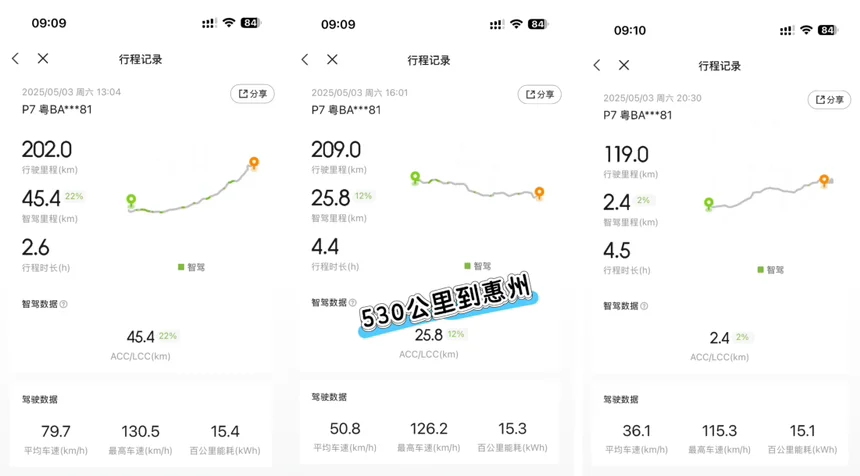 530公里路从下午跑到了晚上12点半到目的地,电量也剩多了,只有7%左右的电量(我的P7是670N版本,WLTP满电是576公里续航)。