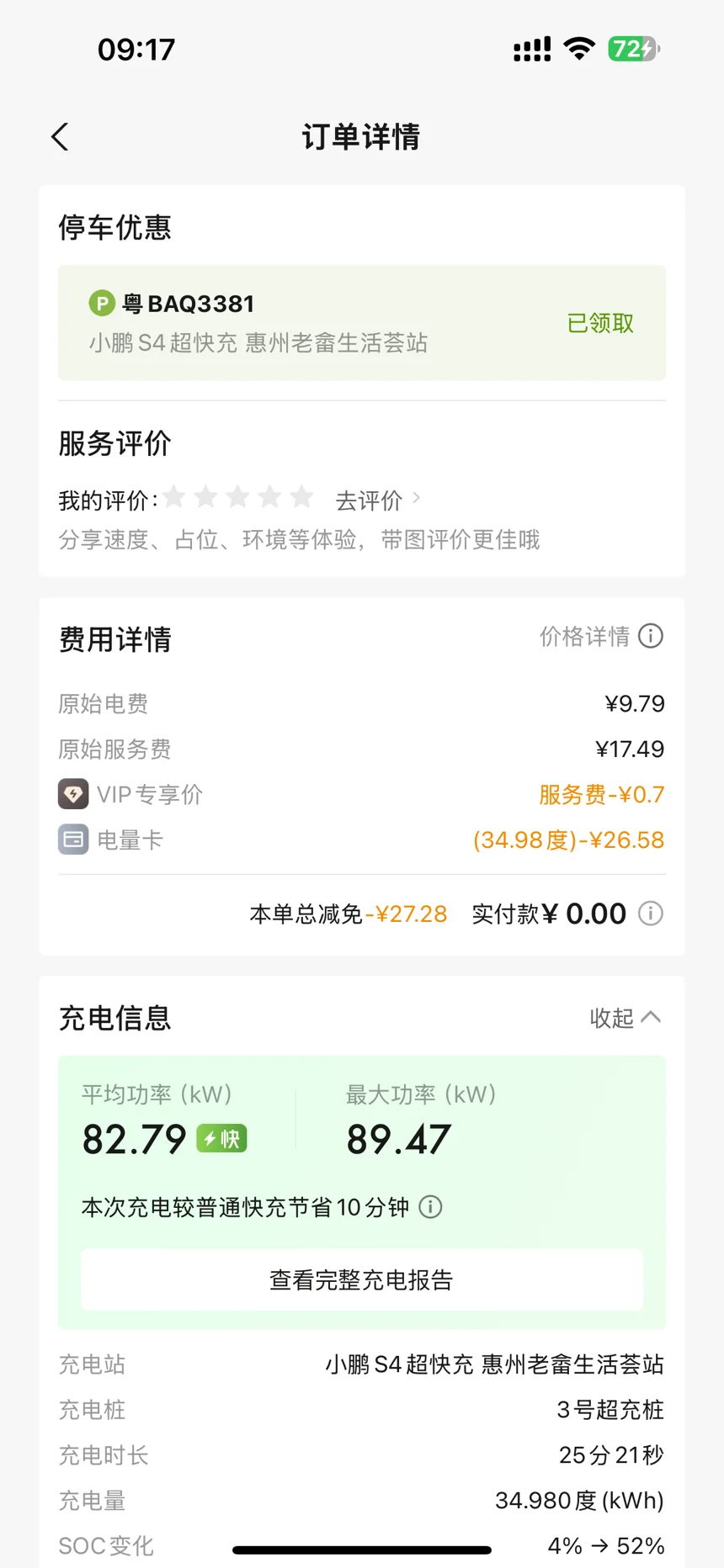 在APP订单详情里,我详细查看了充电数据:充电时长25分21秒,充进约35度电,SOC从4%增至52%,最大功率达到了89.47kw,平均功率也有82.79kw之高。