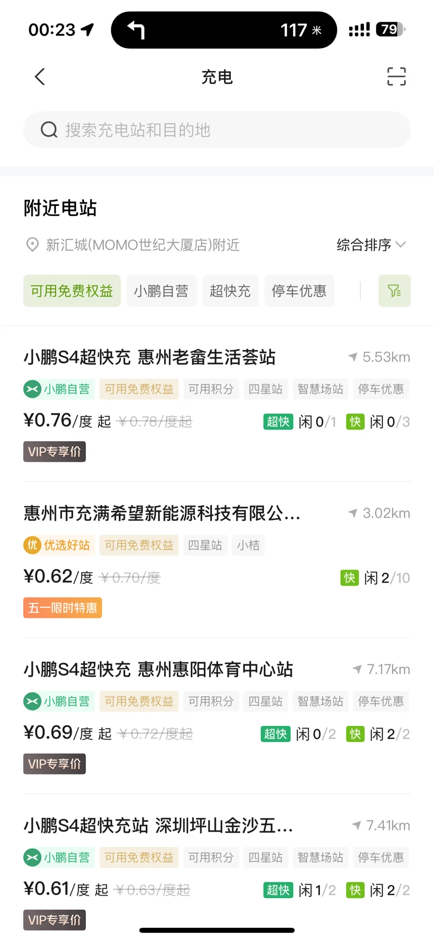 通过小鹏APP,我提前查好了目的地附近的充电桩,最终选定了系统推荐的第一个——小鹏S4超快充惠州老畲生活荟站。这个充电桩距离我们的目的地仅有5.53公里,而且附近还有不少美食。毕竟,大家坐了一天的车,在服务区吃的都是零食,早就想好好吃一顿正餐了。我打算在充电的时间里,既能让爱车补充能量,也能让我们的肚子得到满足,真正做到一举两得。