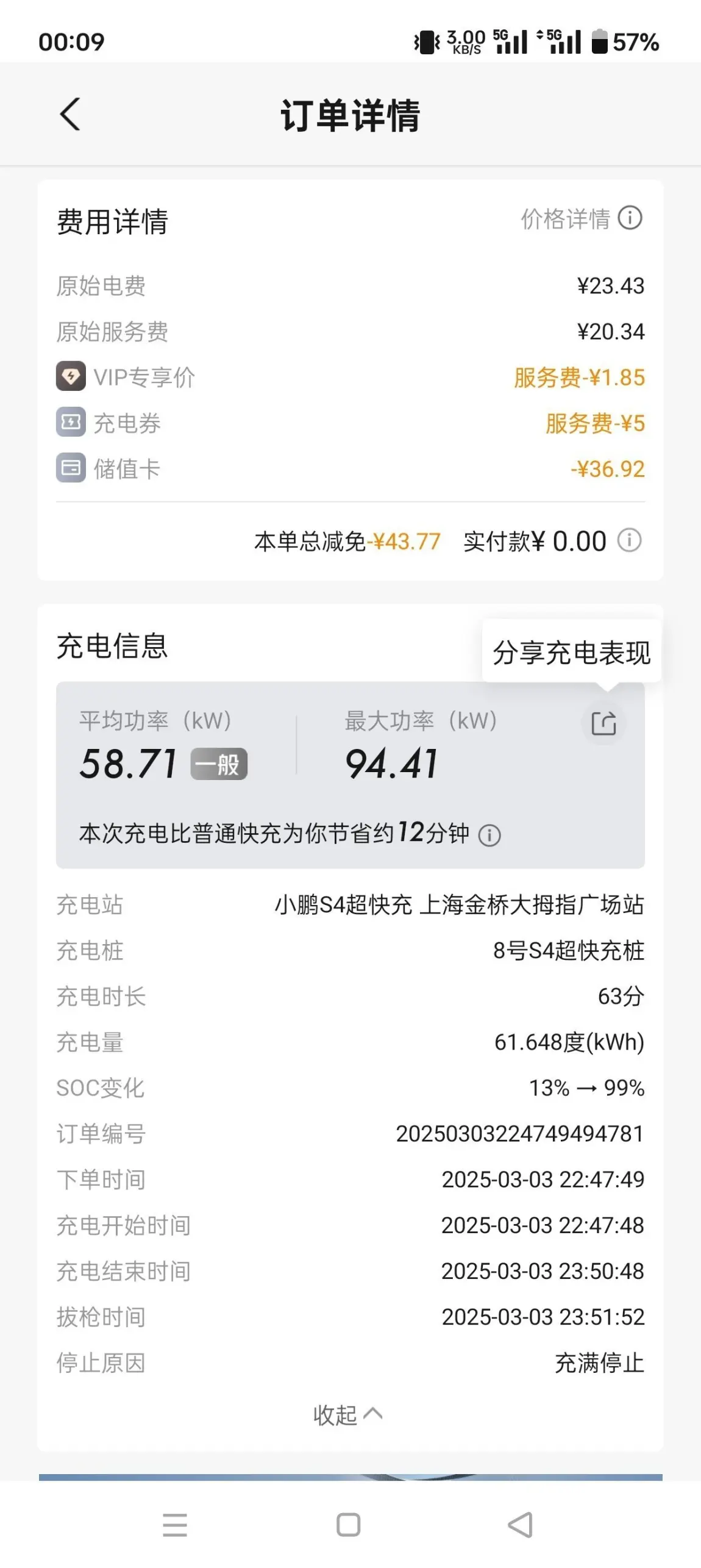恭喜新提车的鹏友!车门一关,平平安安。车灯一亮,前途无量。挂档起步,一路暴富。手刹一松,一路顺风。小鹏自营超充太给力了,一个小时不到充了61度用上优惠券花费36.92,鹏友们记得领券!长按二维码识别领小鹏充电券哦