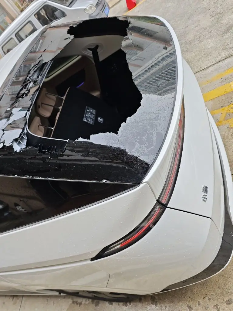 自从被自家的外墙小瓷片砸碎玻璃后,现在充电我都感到很害怕😭唉,买不起地库车位的心酸与无奈😭原本只是被小瓷片高空下坠撞击出现裂缝,由于下暴雨,雨水的冲击力逐渐把出现裂缝的玻璃破防……贴膜是没用的,不用跟我杠,因为隔热膜不像手机钢化膜那样贴在外面做防护,该碎的还得碎,另外,好的隔热膜一块要4位数,都够我换一次玻璃的钱了😓