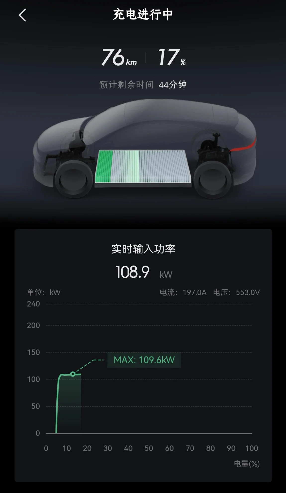 120kw随便找的桩,直接100起了,果然是不挑桩的小鹏!手机小鹏app实时电量显示数据也挺详实