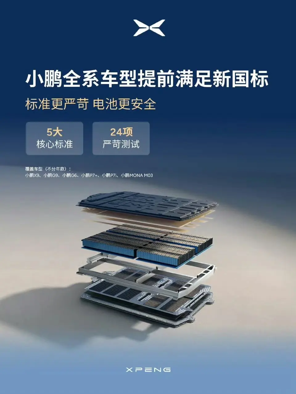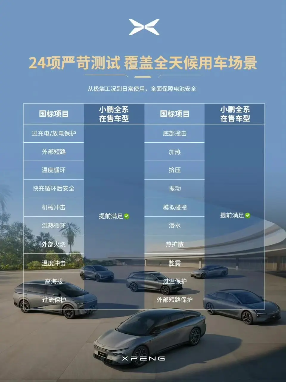 再说那24项严苛测试,从过充过放保护、外部短路、温度循环到挤压、振动、模拟碰撞等等,覆盖极端到日常的用车场景。像小鹏X9、G9、G6、P7+这些车型都涵盖进去。