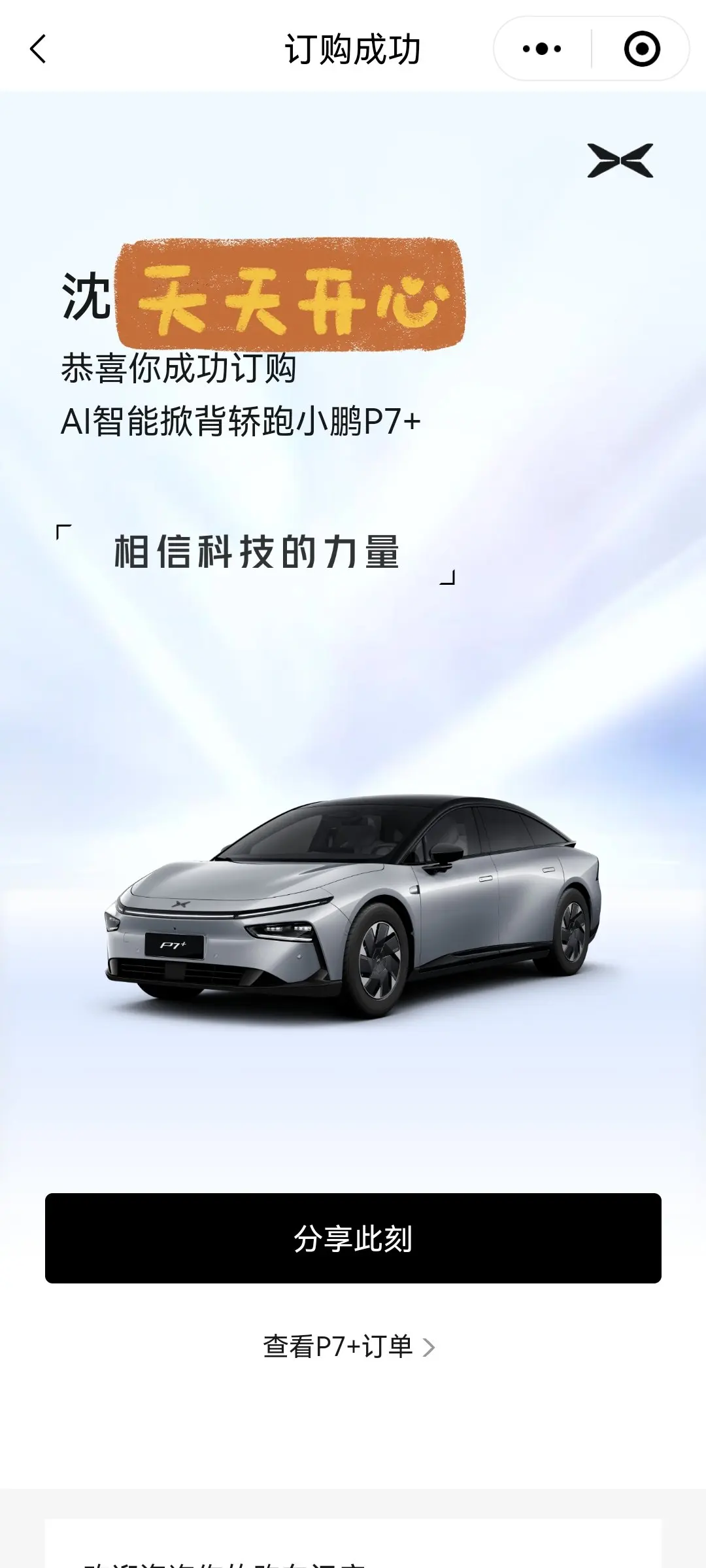上个月车子去闵行店做保养,加了工作人员的微信,这次因为我的车泊车异常,又去闵行店维修,试驾了P7+,工作人员讲解很细心,维修过程中,定了P7+,把老公的小鹏p5置换成P7+