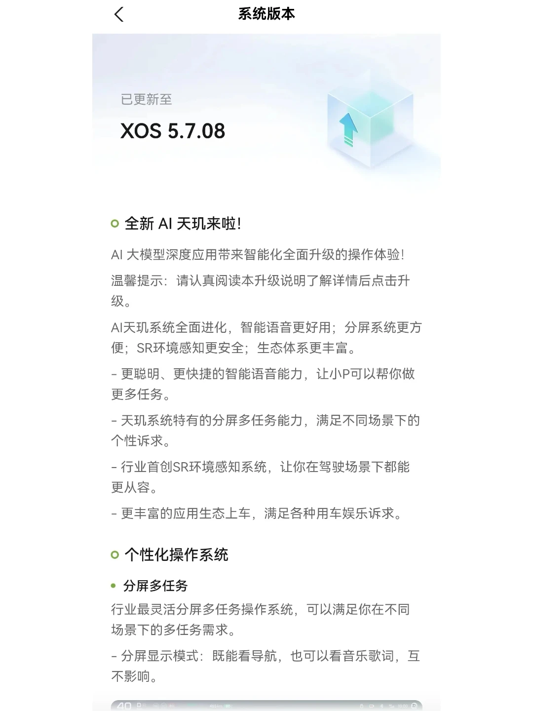 - 语音交互更强大:搭载自研XGPT大语言模型,语音语义理解准确率提升40%,语音响应平均0.9秒就能完成操作。AI助手“小P”可深度理解用户需求,支持全车超90%功能的语音控制,包括连续对话、多指令并行执行等。比如可以通过自然语言指令调整空调风向、座椅按摩模式等细节功能。
