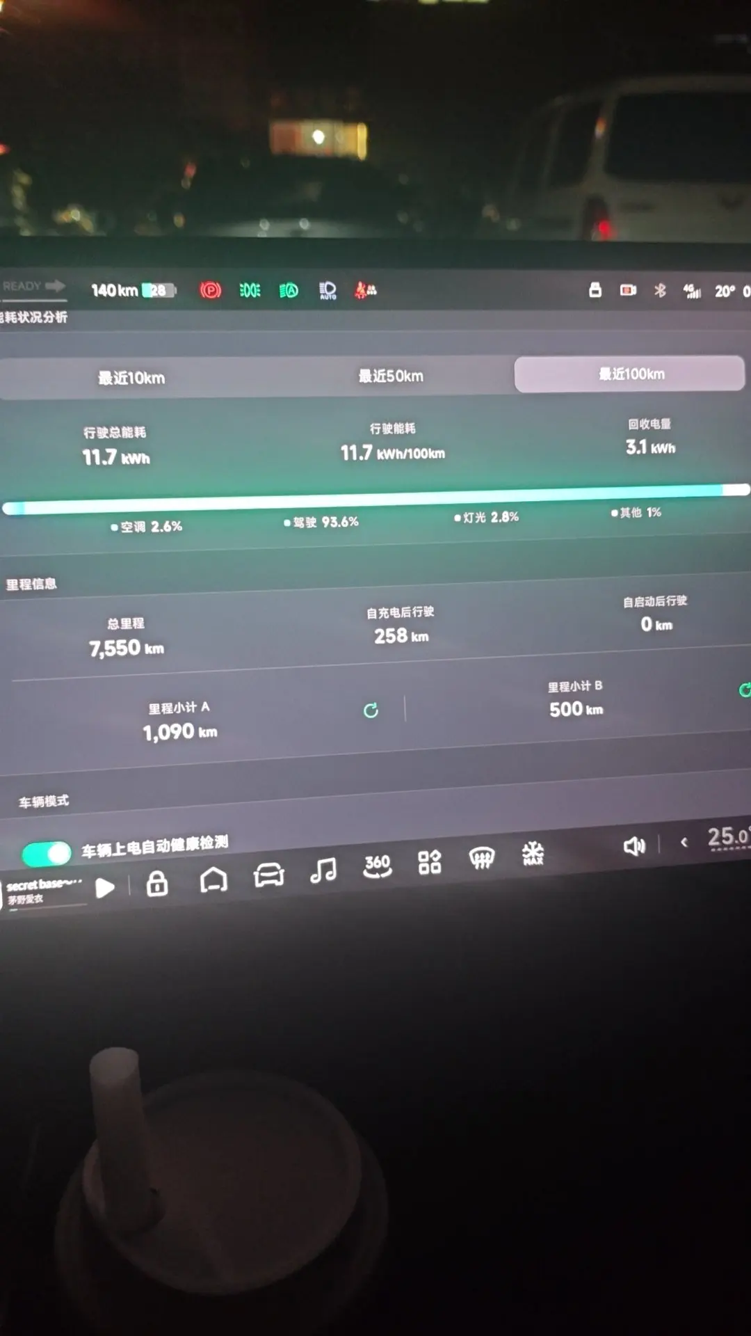 以下正文,节能和舒适驾驶体验没啥差,运动的加速感明显,能耗能高20%,自己取舍,lcc其实很耗电,充满电记得尽快拔充电头,一直插着的耗电和开了哨兵差不多,脚法这因人而异,更新系统后刹车的敏感度有点降低,其他没啥了,哦对了高速时候大于130耗电剧增,110-130其实大差不差,建议卡130开,好像需要300字,我水点字数扒拉一下…端午跑了趟洛阳到徐州,回来赶上了暴雨,好家伙空调全开前后除雾一直开,雨刷最大,那个能耗还不到14,还有就是希望增加本段行程的平均能耗,不用隔一天自己app上查。