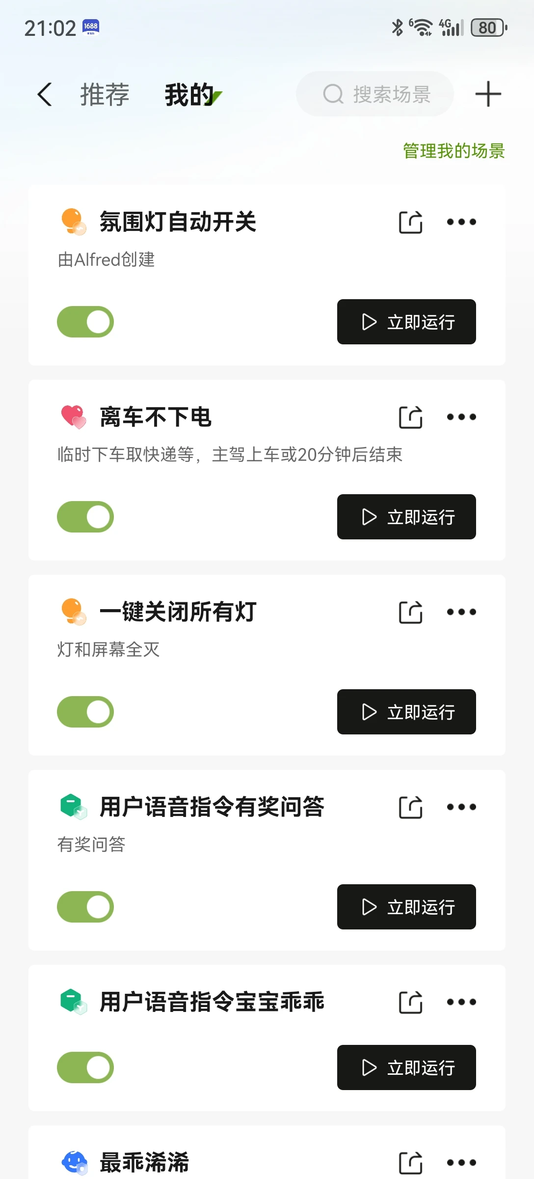 2️⃣智慧语音场景:从油车换电车,让我觉得电车最大的方便就是有此场景,可以自己编辑,也可以在APP上下载适合自己的场景。简直就是哄娃神器,实现智能化开车体验。