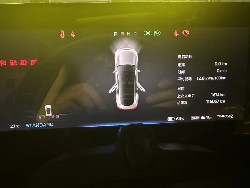 晚上吃完了晚饭,7点42分开始出发。出发前我P7的WLTP电量是364公里,驾驶模式设置成标准模式,能量回收设置成低,全程走国道。室外的温度27度,车内的空调就开了24度三档风。