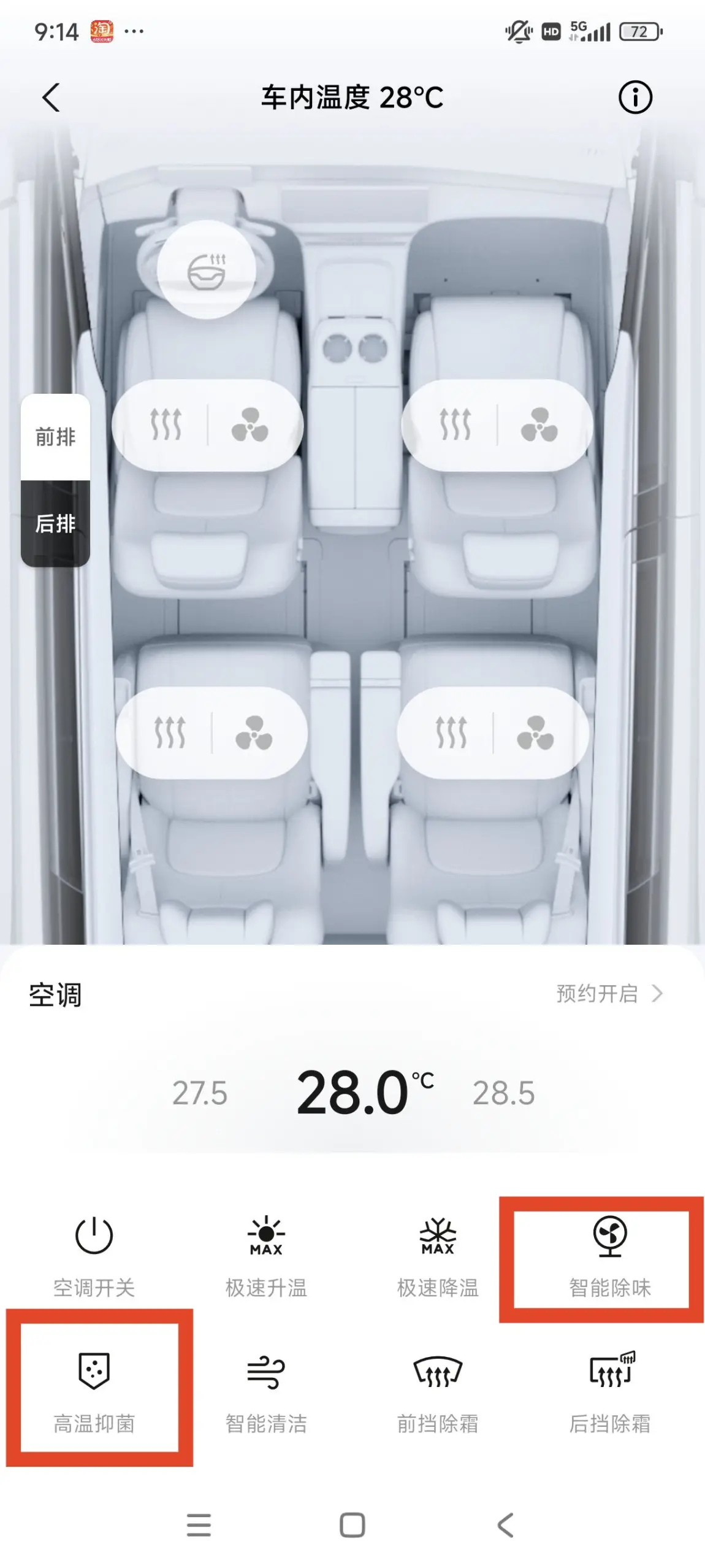 #用车感受 #新能源汽车 #新车除甲醛 小鹏X9提车一周了,讲讲新车去味的一些个人经验,供车友们参考。新车的味道的确是大了点,这一点试驾25款X9是已经觉察到,晚上提车回家,先设置了一下高温抑菌(图一),此功能最高温能达到50℃左右,非常利于甲醛释放,时长约一小时,缺点就是耗电量大。