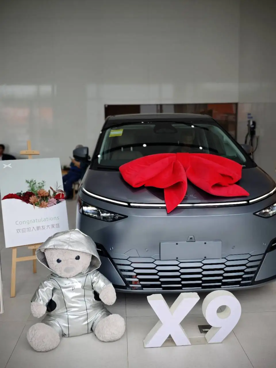 选了哑光灰色的小鹏X9,像一个移动的家,跟家人一起提车,虽然下雨,还是很开心的,马上可以开着我的x9回家了