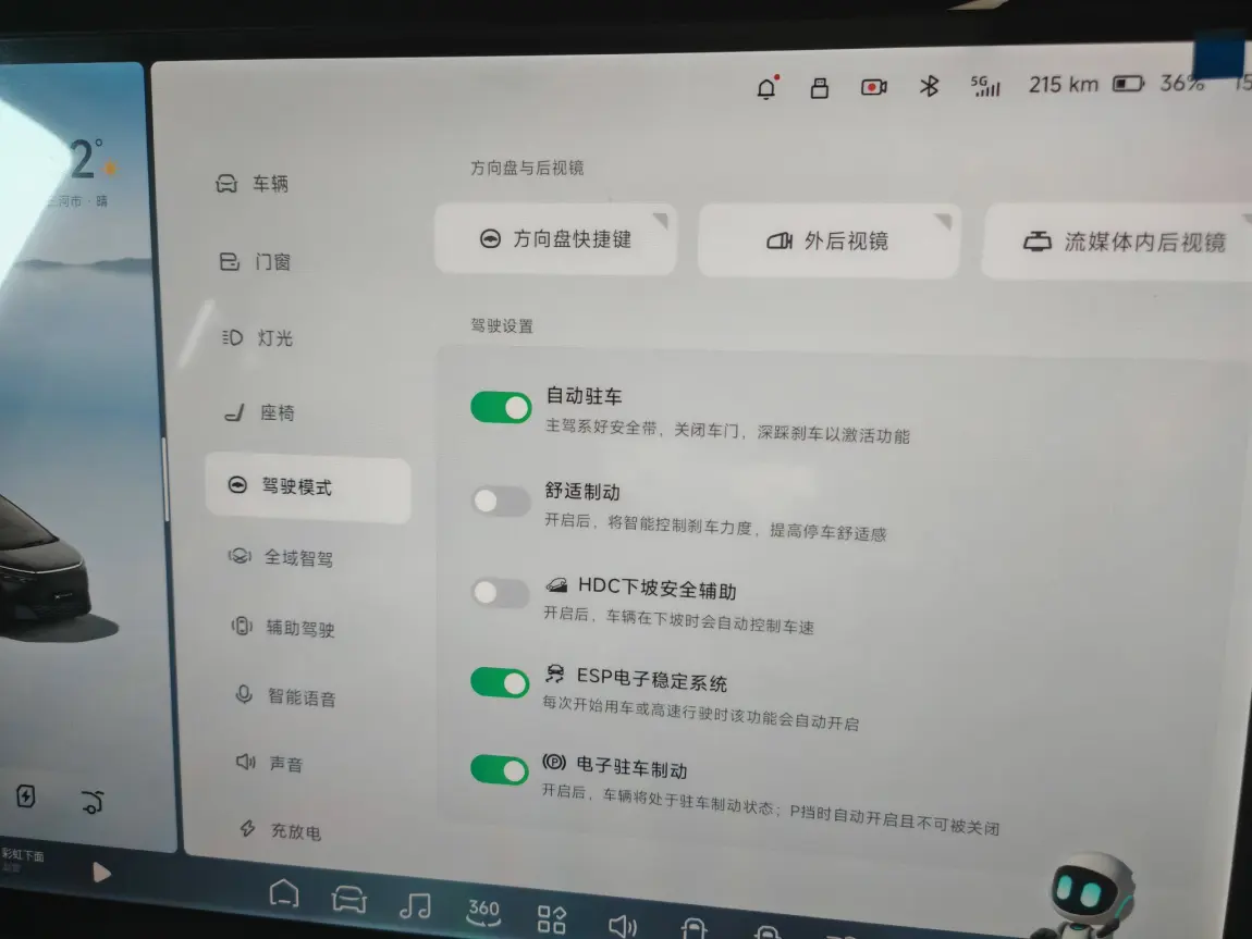 2.舒适制动,需要适应一下,打开后一开始踩刹车会偏软,刹车脚感不是线性的,车速快会有一种刹不住的感觉。建议关掉。