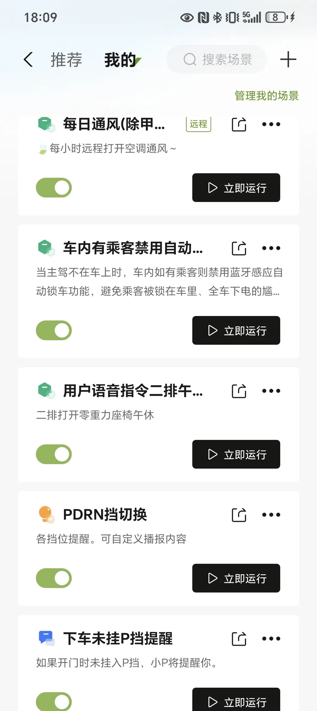 5.几个好用的智慧场景推荐1)洗车3.0 2)下车未挂P档提醒 3)换挡提示音 4)每日通风除甲醛。 新车可以打开高温杀菌模式,结束后打开车窗,空气净化。一周就没有味道了。