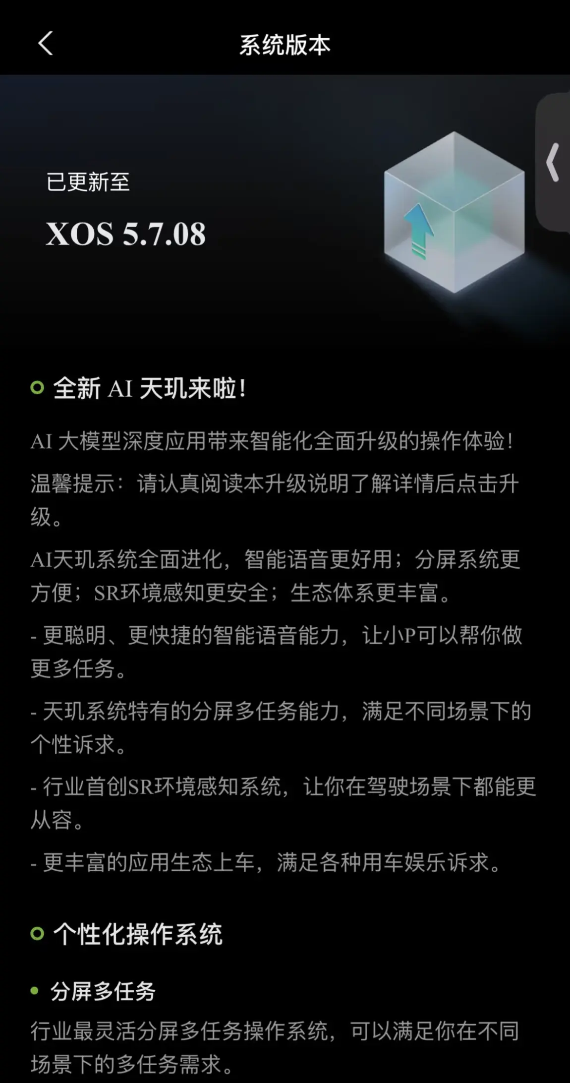 #小鹏MONA天玑新增300+功能# 终于升级了,等了好久的天玑系统终于到来了,怎么说了,增加了好多功能,还得在习惯习惯,但是原本的3d地图感觉更加好看了,现在没有了原本融合的高级感,其他到还好,升级的远程查看,场景模式等功能,还是非常非常实用的,期待后续更加完善吧。