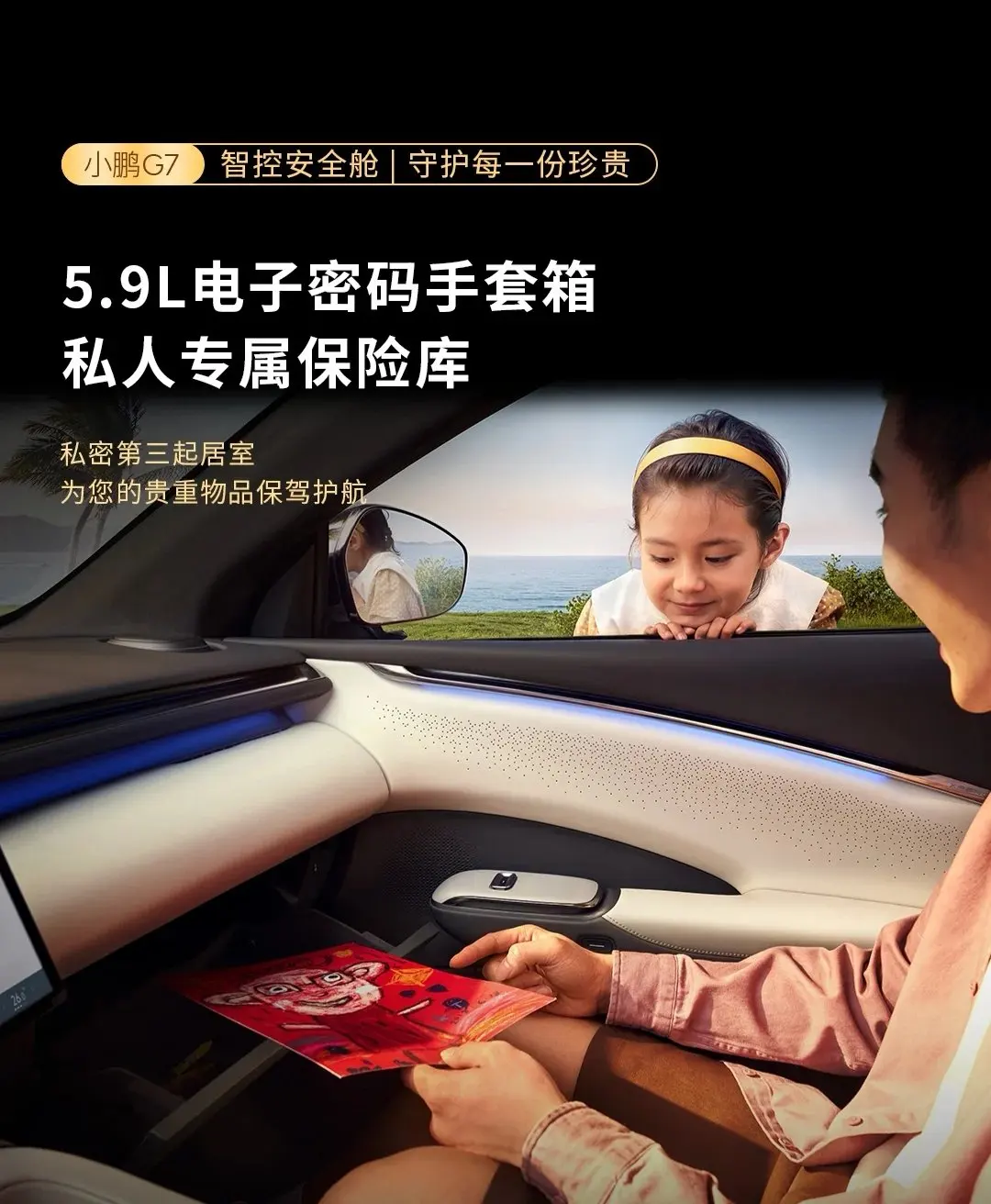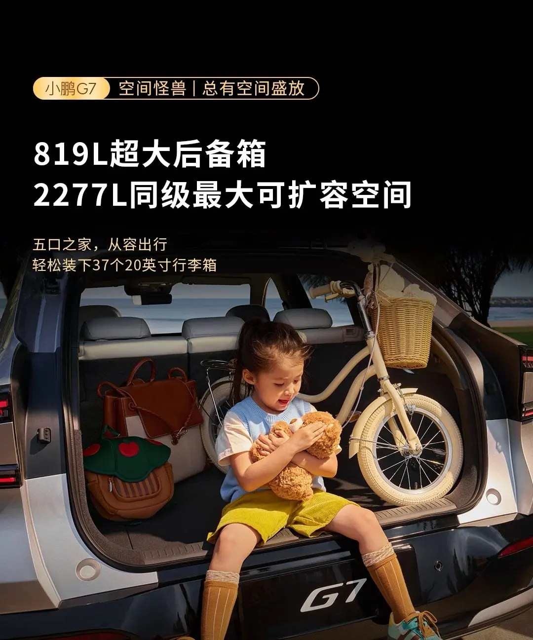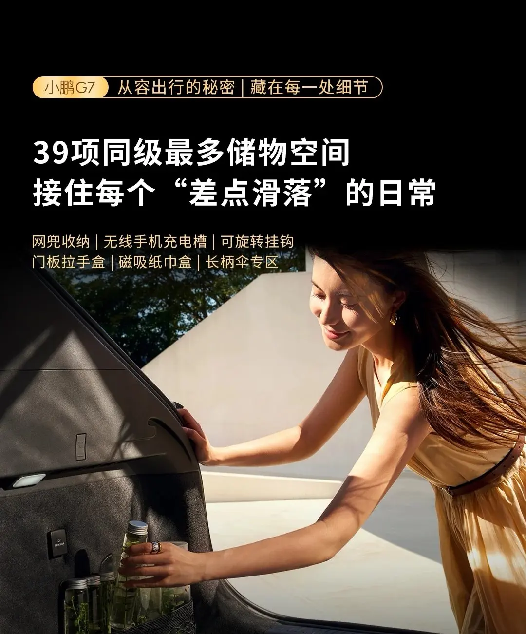 #小鹏G7的100处设计小心思# 满满都是细节:它有着88%同级更优得房率,全车39项魔术收纳空间,像无线手机充电槽、可旋转挂钩等日常物品都有专属位置。42l可水洗前备厢,无惧污渍;819L超大后备箱,2277L最大可扩容空间,出行装载无压力。5.9L电子密码手套箱,守护隐私。还有带磁吸功能可折叠小桌板,旅途追剧、干饭更惬意 。
