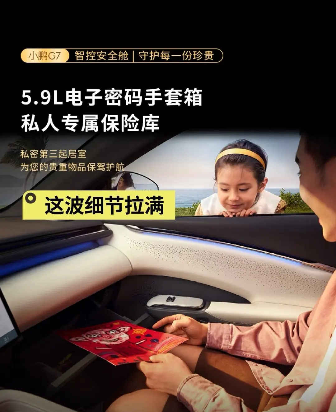 #小鹏G7的100处设计小心思# 小鹏居然给副驾驶手套箱了,还是带密码锁的 细节拉满了了呀,同时还有好多细节,比如说后排的网兜收纳,后排无线充电槽,还有旋转挂钩,磁吸纸巾盒等等,可以说是能有的细节都有了!最让人钟意的是后排中间小屏,和tsl看齐!