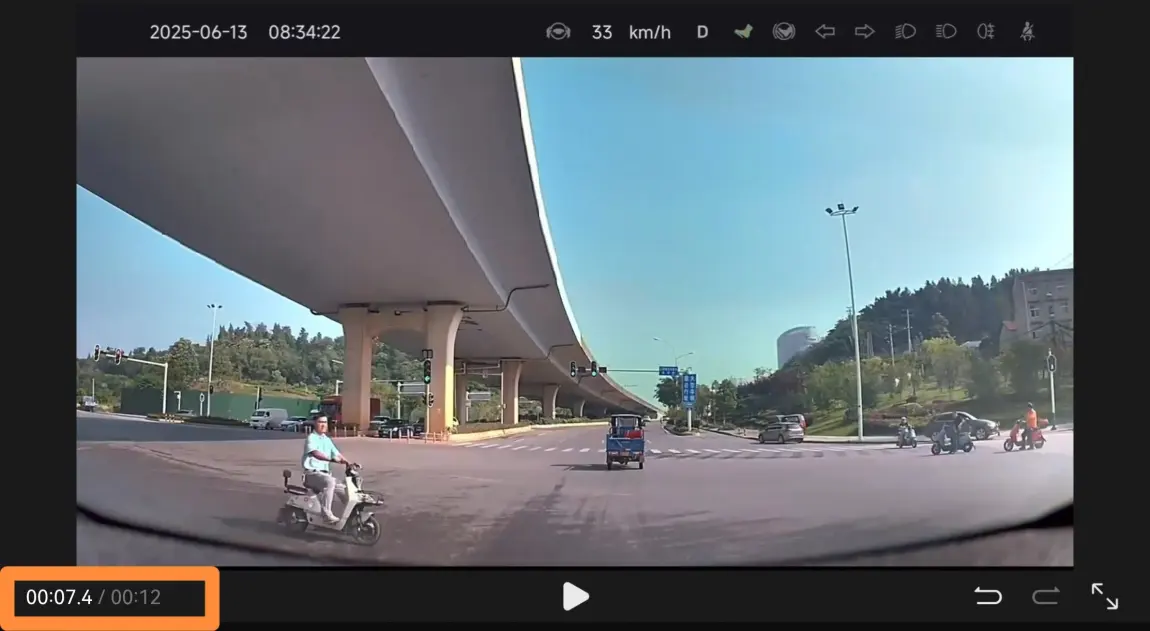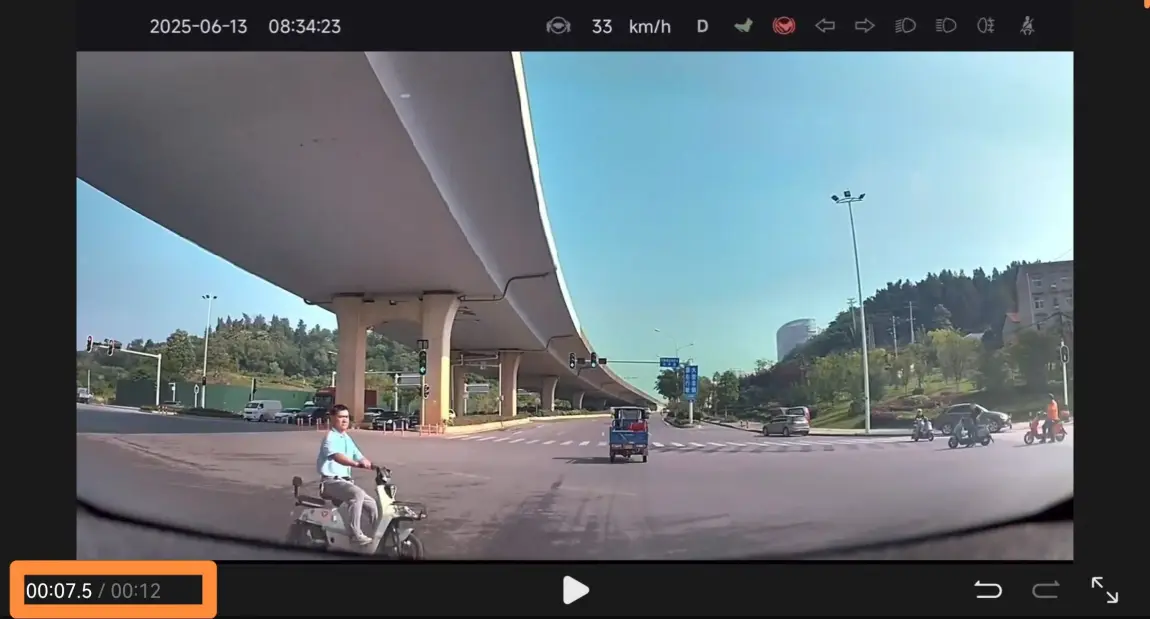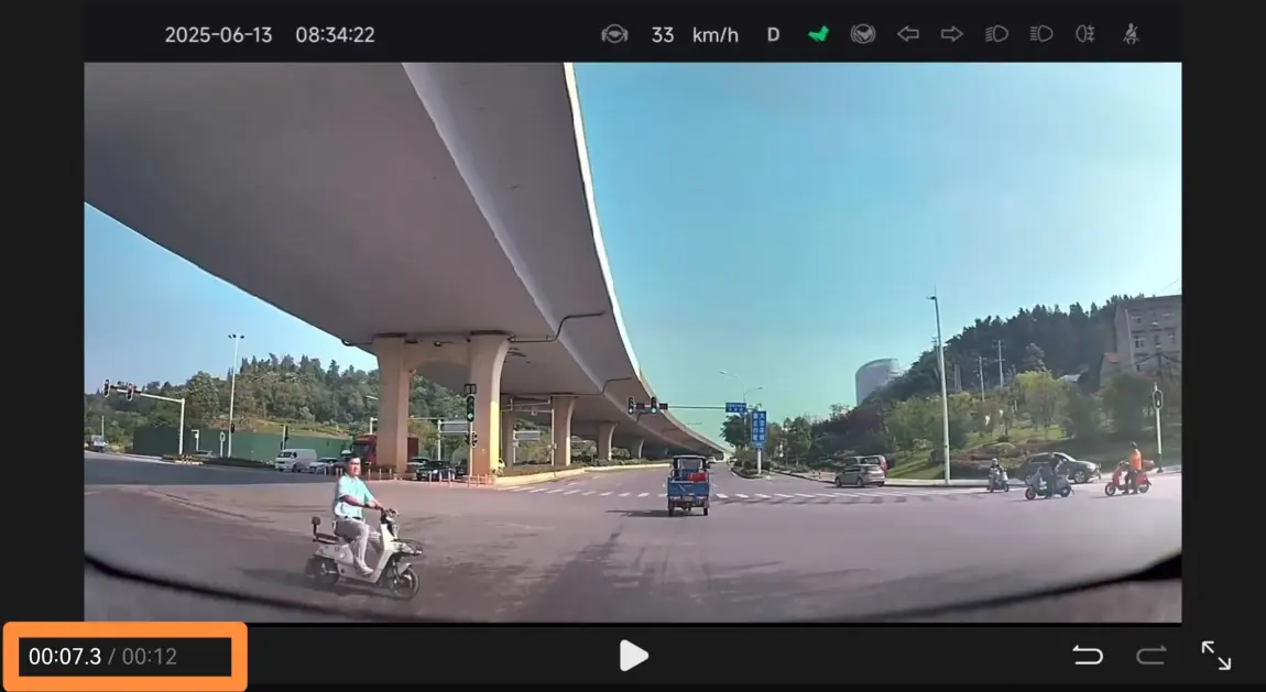 - 7.3秒:驾驶员加速期间(视频截图中绿色加速标志亮起)发现两轮电动车,车辆时速33km/h(≈9.17m/s);