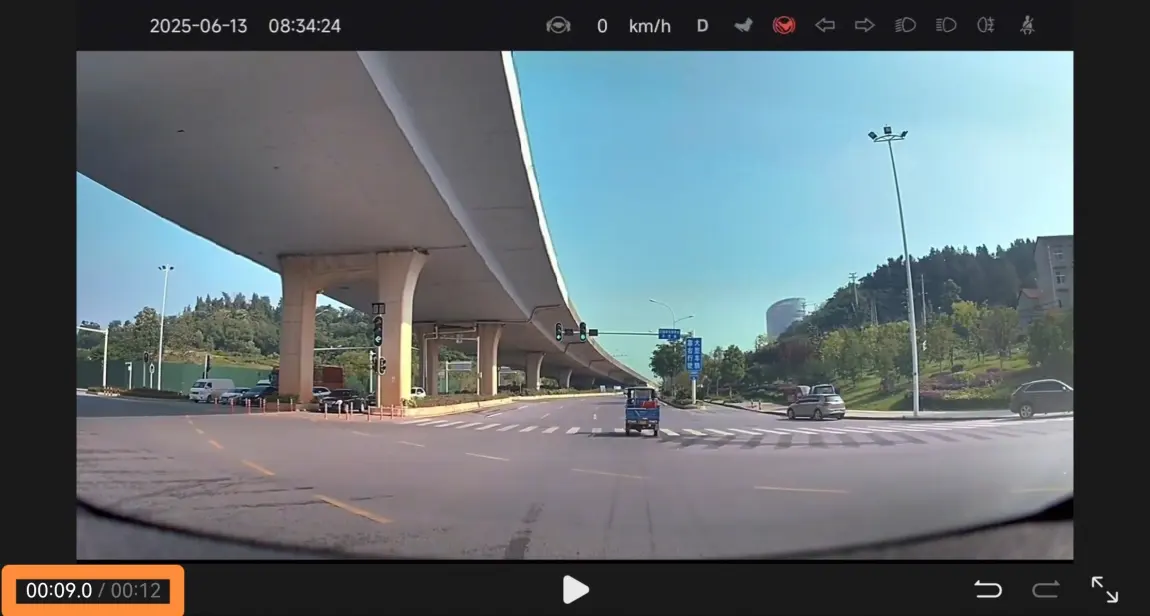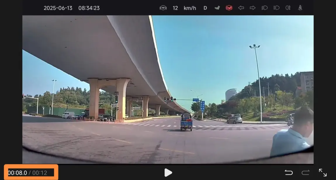 根据用户手册说明书,“车辆经过高架桥、人行天桥、路牌下方时” 以及“目标突然出现。例如,突然有其他车辆快速移动或近距离移动到本车前方”属于FCW/AEB“可能受限或无法发挥作用”的场景。该场景下,雷达/摄像头视野易受高架桥结构干扰,系统对前方目标(如电动车)的探测能力下降,或者由于两轮电动车突然出现,大概率未触发前方碰撞预警(FCW)(五张视频截图均无双闪灯标志亮起),更无法触发自动紧急制动(AEB)(AEB需以FCW预警为前提,且依赖系统有效探测)。