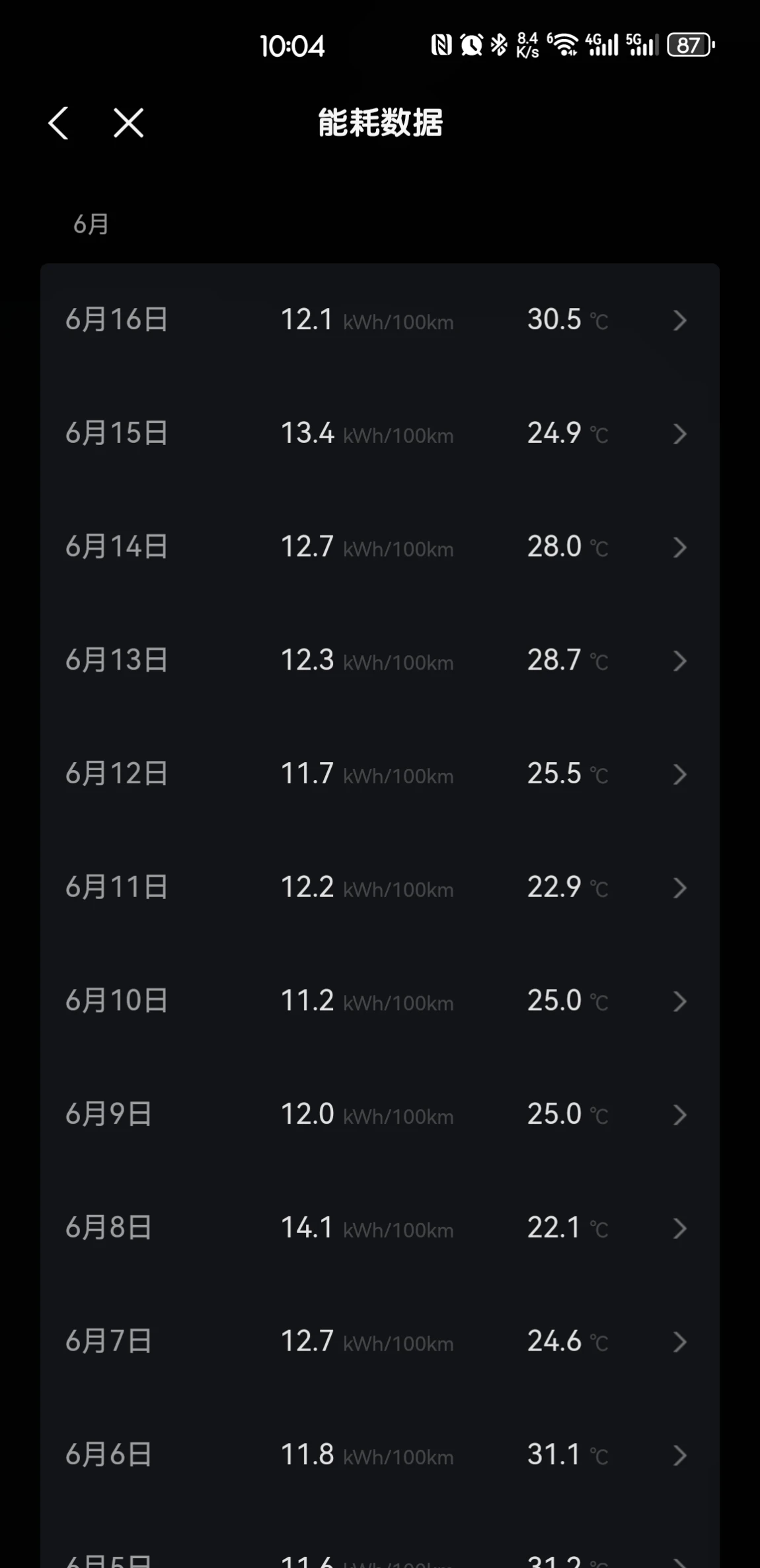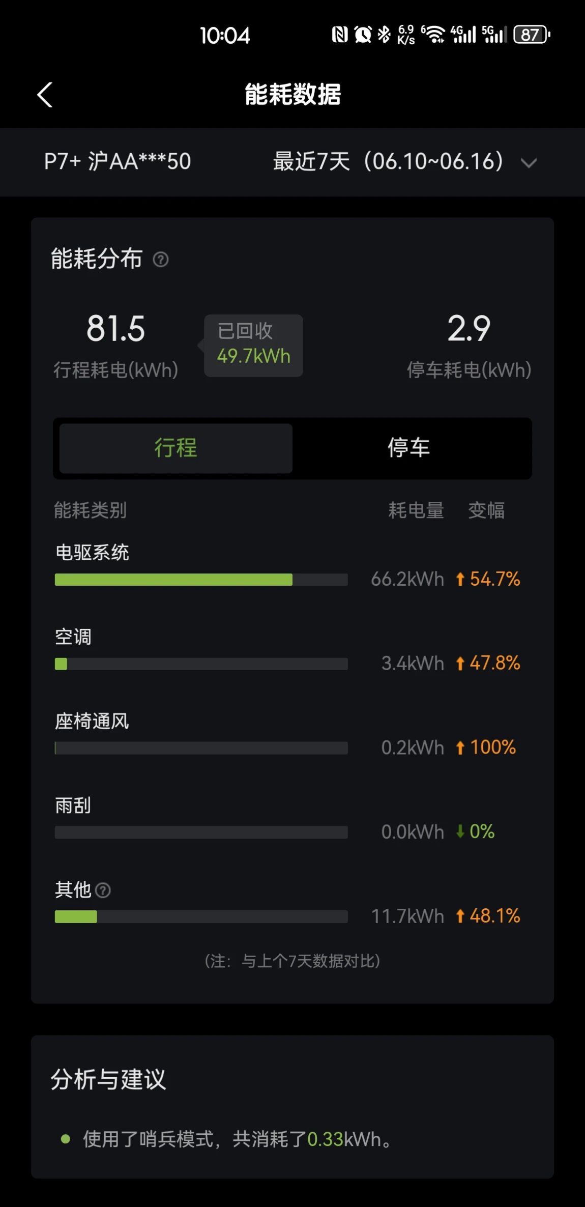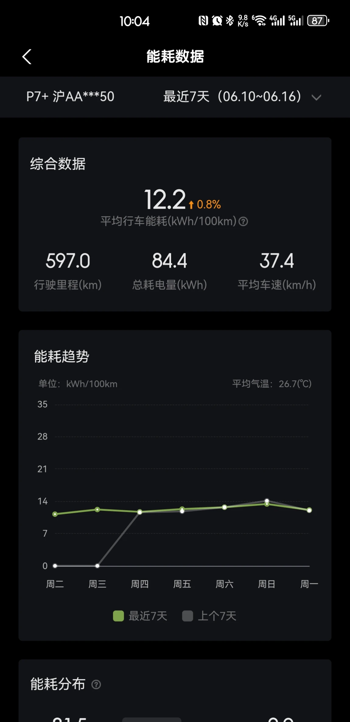 每周能耗打卡,新车第二周,能耗很稳定,果然比老P7好多了空调随便开也就12,不过常去的超充站都是150KW桩实际也就120到头了,属实充电速度上不去啊😂