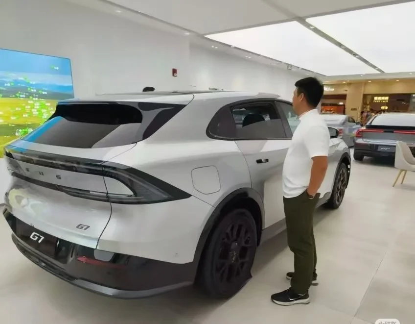 今天本来是去商场买奶茶的,结果路过小鹏门店就被新到的G7勾住魂了!这车比网上看到的图片还要惊艳,特别是那个星际绿配色,在阳光下会变色,从墨绿到蓝灰的渐变效果太高级了!忍不住让销售帮忙拍了张合影,发朋友圈瞬间收获20+点赞~