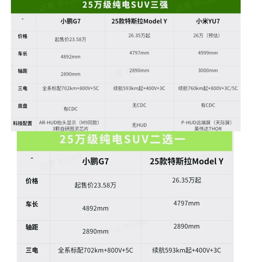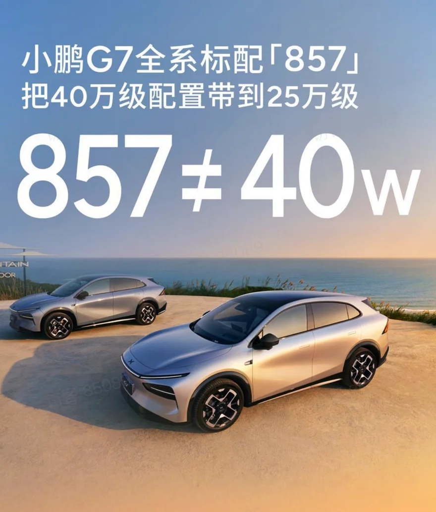 #小鹏G7同级唯一标配857# 最近和大家见面的小鹏G7可谓是诚意十足,标配857智能芯片、全域800V快充高压平台、5c超充电池包、超过700km的cltc续航等等,这换做其他品牌肯定是在40万级别的了,但是小鹏做到了预售价低于23万,你说性价比高不高,对比未上市的小米YU7和魔豆Y优势都挺大的,再加上高标准的抬头显示、电吸门、高级氛围灯可以说真的很有竞争力!30万以内的产品,决赛圈只有这三款吧?你说呢!