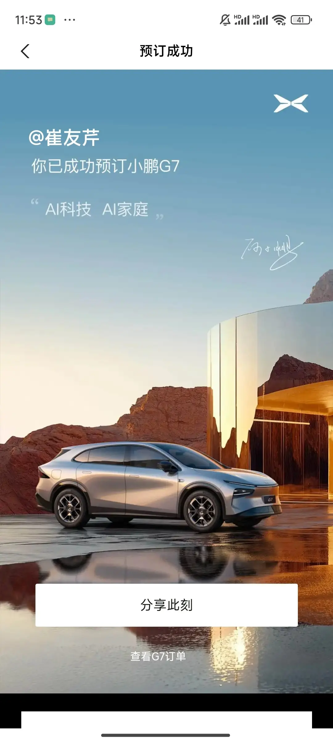 #小鹏G7开启预订# 终于下定决心预订小鹏G7了!从第一次在展厅看到它就被深深吸引,这段时间反复对比参数、看评测视频,越了解越心动。800V高压平台和5C超快充技术彻底打消了我的续航焦虑,700公里的超长续航完全能满足我周末自驾游的需求。最期待的还是那个科技感爆棚的智能座舱,听说系统特别流畅。交完定金后,每天都要打开APP看看订单状态,已经开始想象开着它在城市穿梭的样子了。等待交付的这段时间,连刷到小鹏的广告都会多看几眼,这种期待新车的感觉,就像小时候盼着过年一样!