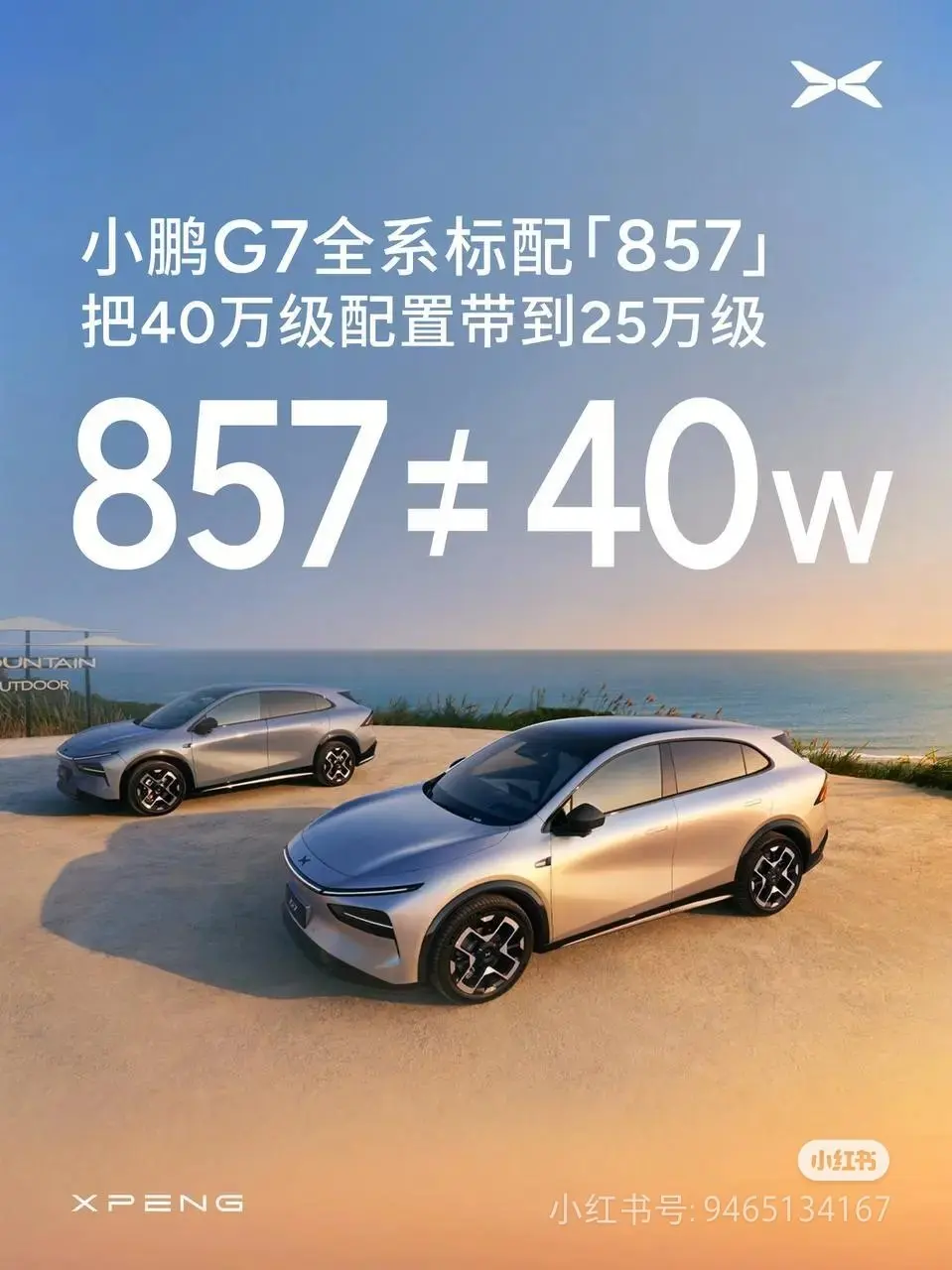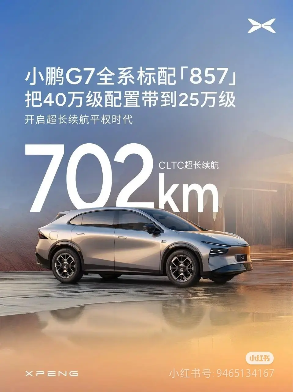 #小鹏G7同级唯一标配857# 小鹏G7 全系标配857硬核三电系统——全域800V高压SiC平台、5C超充AI电池、702km CLTC超长续航,这些曾经只在40万+高端纯电车型才有的“王炸”配置 ,如今被小鹏G7一股脑塞进了25万级的车型里!预售价仅23.58万起的小鹏G7,堪称纯电SUV界的“性价比刺客”。当别家还在把800V高压平台、5C超充当作高配专属时,它直接将顶级配置“全员普及”,用实实在在的科技平权,让普通消费者也能享受高端纯电技术带来的畅快体验。从续航焦虑到充电自由,从性能到性价比,小鹏G7这次精准踩中用户需求点,爆款潜质已然拉满,25万级纯电SUV市场的格局,怕是要被彻底改写!