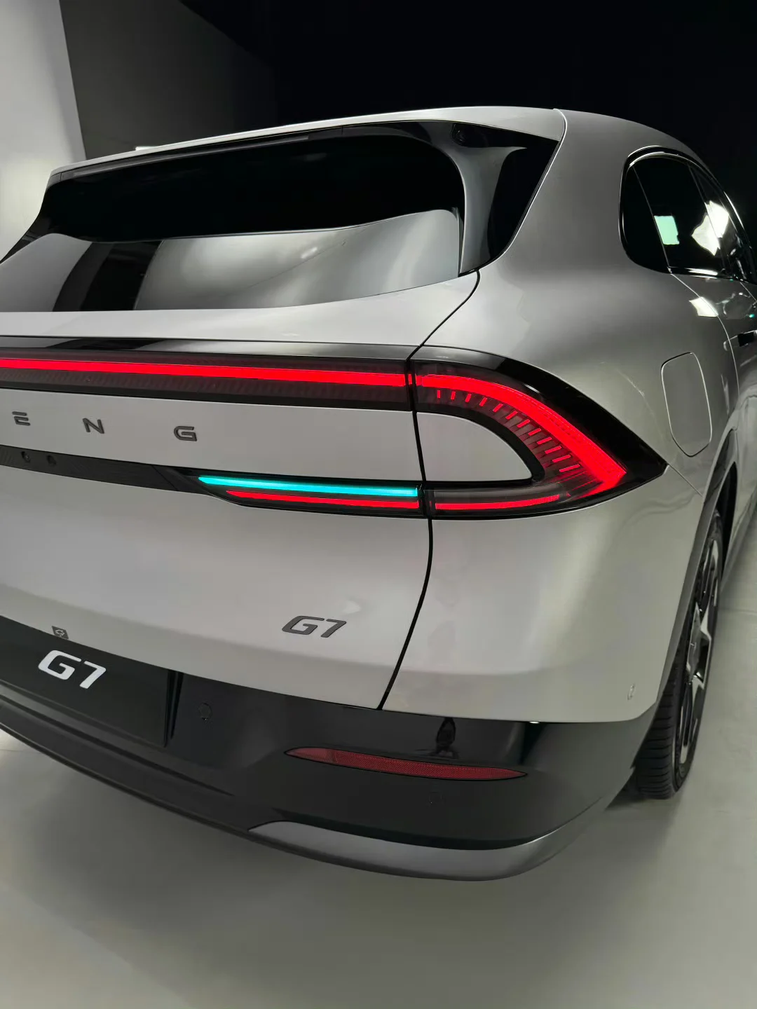 #小鹏G7重新定义出行美学# 小鹏G7给我的第一视觉冲击是"未来感与力量感的完美平衡"。新车采用第二代X-Robot Face设计语言,前脸最吸睛的是贯穿式星际光剑大灯,配合两侧分体式矩阵大灯,夜间点亮时极具辨识度。车身侧面采用"星舰式"溜背造型,无框车门搭配隐藏式门把手,风阻系数低至0.238Cd。尾部设计层次分明,超宽贯穿式尾灯与激光雕刻纹理的尾翼相得益彰。特别值得一提的是,G7首次采用"悬浮式"轮眉设计,搭配20英寸低风阻轮毂,既提升了视觉张力又优化了空气动力学。整体来看,G7的外观在保留家族特征的同时,通过更多锐利线条和科技元素,成功塑造出比G9更年轻运动的形象。