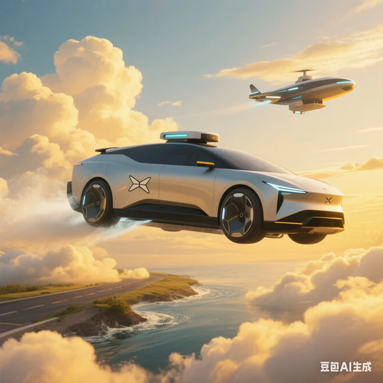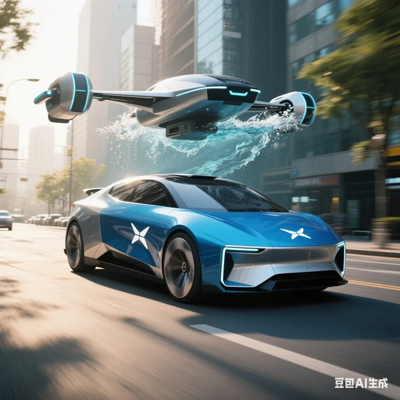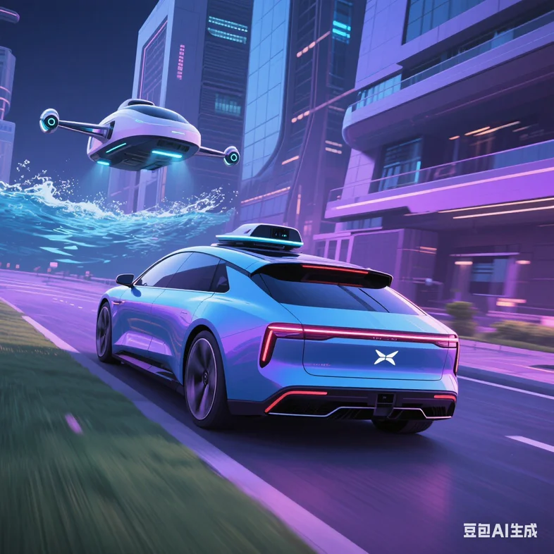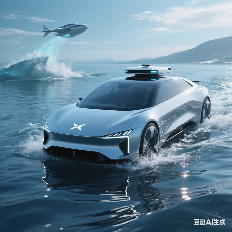 #我的科幻座驾# 请你帮我创作一个未来科技汽车,要求它拥有陆地行走、空中飞行,水中遨游的功能,而且它不需要人驾驶,非常炫酷,如果可以,你可以帮我画上小鹏汽车标志,我觉得小鹏汽车是目前国内最具有科技的汽车企业了。