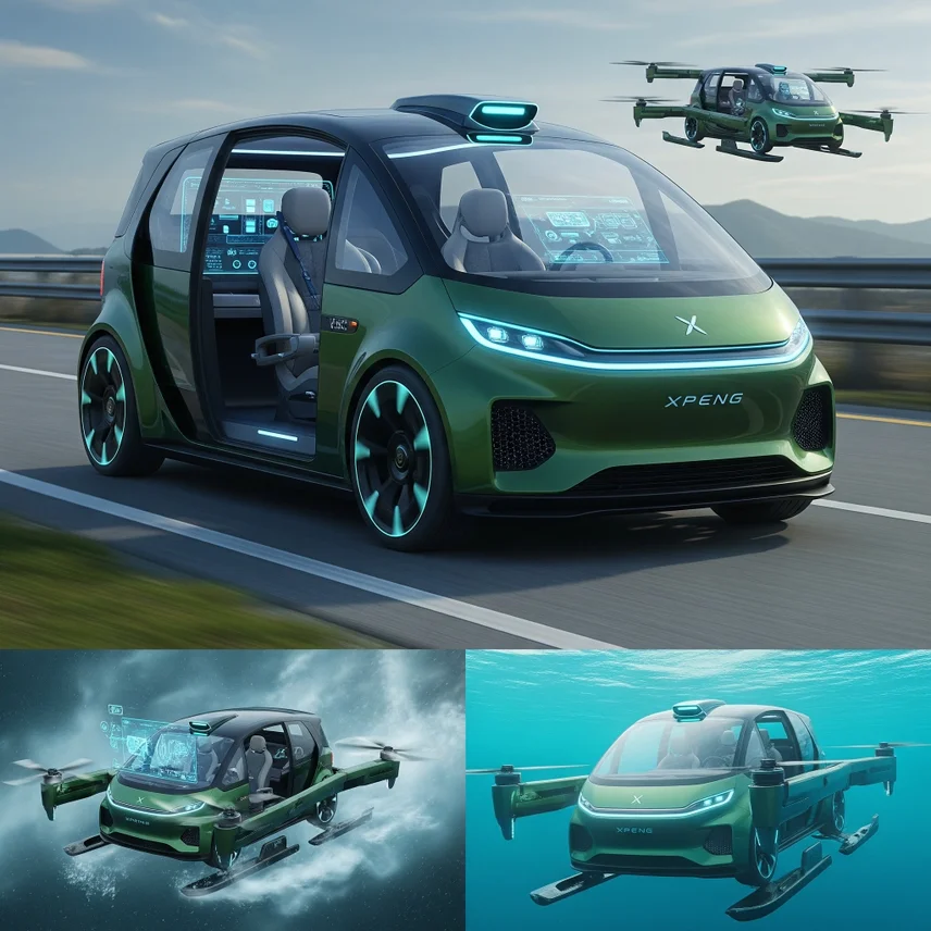 创作理念:一款未来主义智能汽车,将时尚、空气动力学线条与尖端技术无缝融合,并醒目地展示了小鹏汽车的标志。该车的设计注重绿色低碳交通,其内部宽敞,并为残疾人士提供自适应便利功能。该车可在多种使用场景之间轻松转换:在地面上平稳滑行,在没有可见螺旋桨的情况下在空中翱翔,以及在水下优雅地航行。其先进功能超越了基本交通工具,包括可定制的外部照明、全息显示界面和集成的AI驱动的个人助理。该车充满活力但柔和的配色方案融合了深绿色和蓝色,传达了一种环保意识和未来主义的精致感。引人入胜的电影风格渲染展示了这款多功能且技术先进的汽车在各种动态环境中。