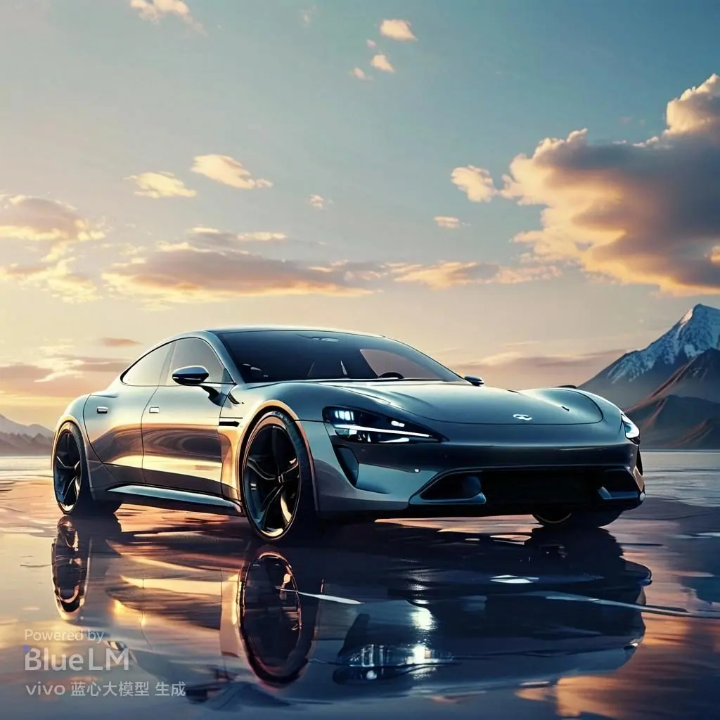 画一个未来汽车的图片,外观设计可以用小鹏汽车的p7为原型,能源类型是新能源。车子要即可以在陆地上跑,也可以在天上飞。外观设计要科幻感十足,有自己的独特之处。
