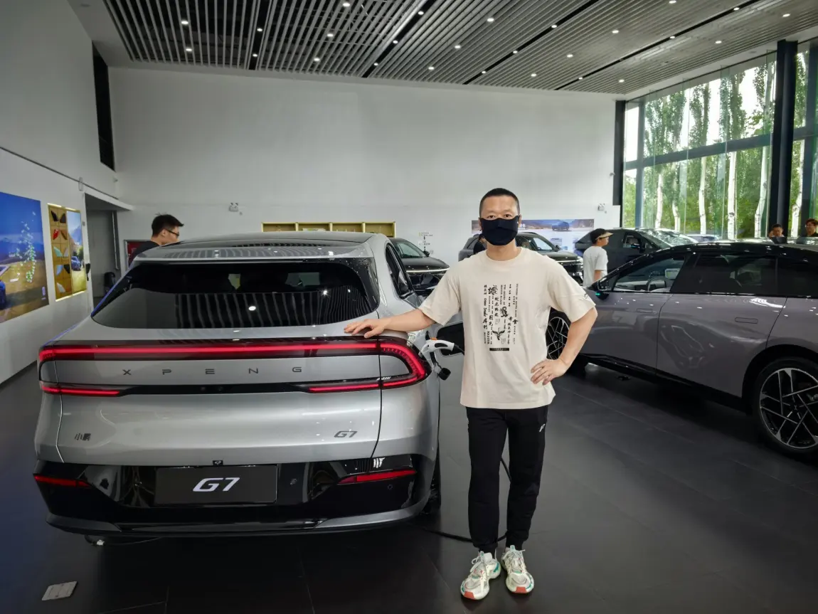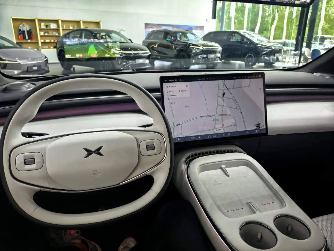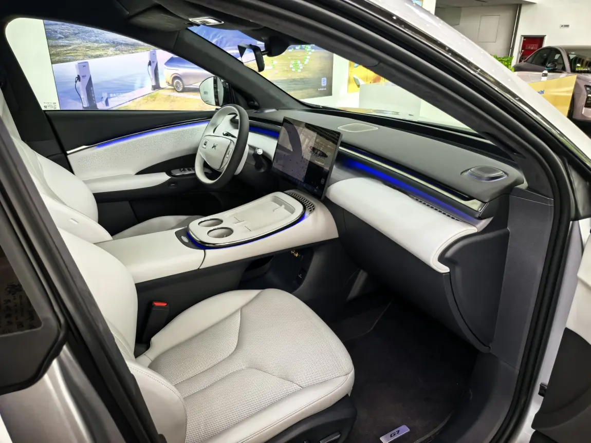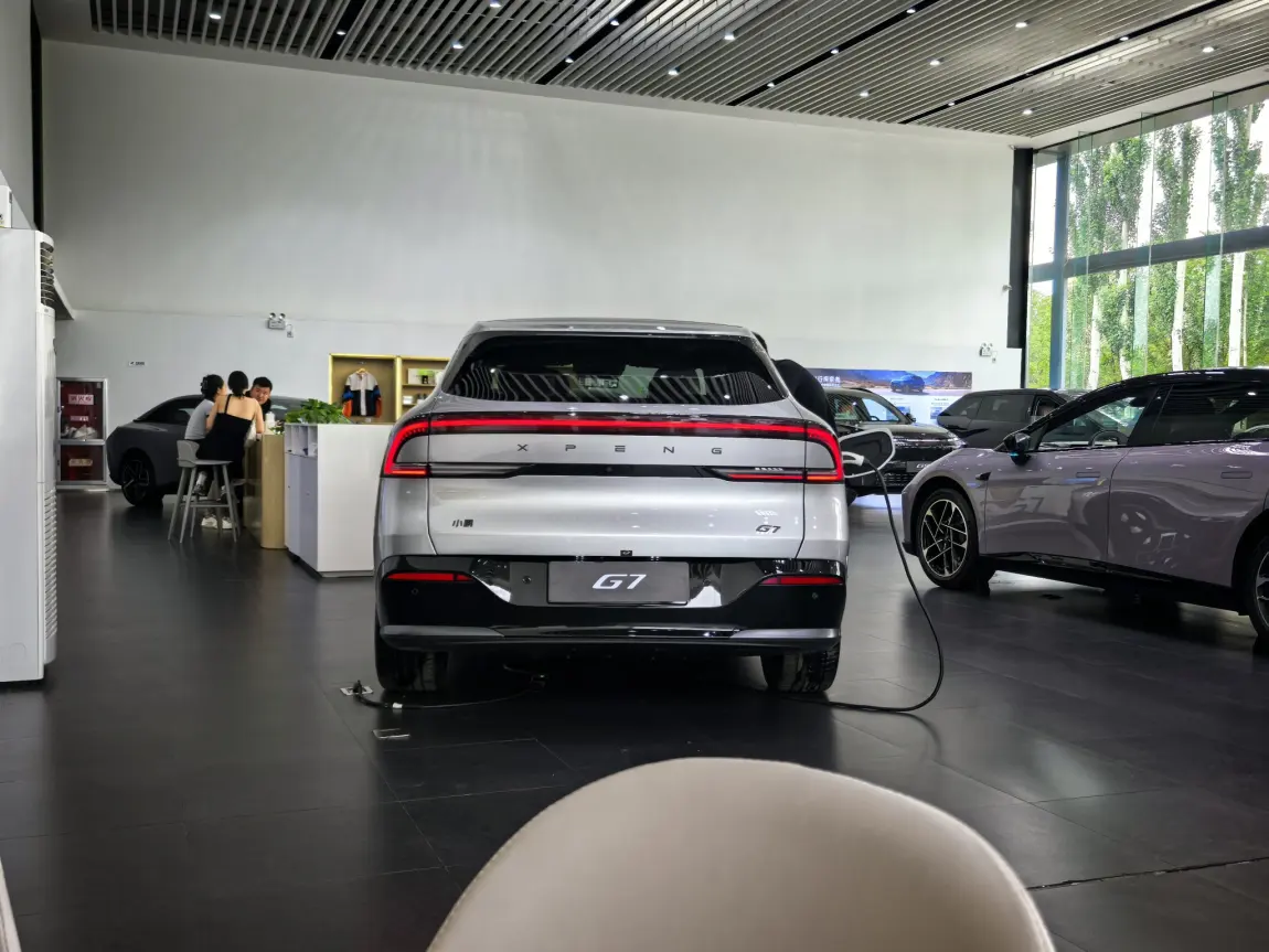 #小鹏G7展车已到店# 听说小鹏G7展车已经到店了,于是第一时间赶到位于银川德胜的小鹏综合服务中心,一探究竟。一进门就看到小鹏G7摆在很显眼得位置。车身尺寸拉长到了快4米9,比旁边的G6大了一圈。车头和小鹏P7+基本一模一样,侧面是溜背造型,用了无框车门和隐藏门把手,轮毂是十字条的20英寸。车尾大灯比P7+更加夸张,折弯更多一些,电吸式尾门,类似超级方便。内饰没仪表盘,改用跟华为合作的AR-HUD抬头显示,能投87寸的图像。开车时导航信息可以直接在眼前显示,还有车道辅助之类的。中控台上有个悬浮大屏,应该还是那套智能系统。方向盘是双幅式,中间有个电子档把,悬浮式中岛台设计、空调出风口是隐藏式的。前排副驾优秀的腿部空间设计,后排空间大的顶呱呱,后排座椅能电动调节,还带加热通风按摩功能。座椅背后的扶手上有折叠小桌板还带无级调节的磁吸支架,手机充电垫是50W的无线快充。顶着俩50W充电板,中间屏幕能看视频打游戏。天窗是全景那种,音响有20个喇叭,曼妙的256色氛围灯、巨大的带补光的主副驾化妆镜。动力系统是后置电机,续航有577到702公里两个版本。智能驾驶用了三颗自研图灵芯片,智驾绝对是强项。这样的G7还不下手等什么呢?@小鹏友 @鹏友大管家