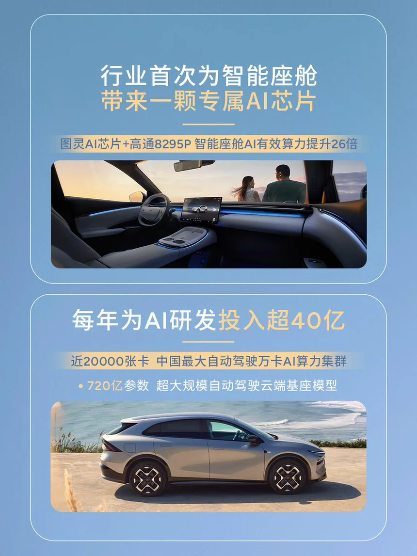 先看这硬核配置——3颗图灵AI芯片坐镇,有效算力直接拉满超2200TOPS!相当于9颗Orin-X芯片,这是什么概念?有效算力直接是行业其它旗舰的3~28倍!更绝的是,它还专门为智能座舱配备了专属AI芯片,座舱AI有效算力暴增26倍!坐在车里,就像拥有了一个超级智能管家,反应速度快到飞起~
