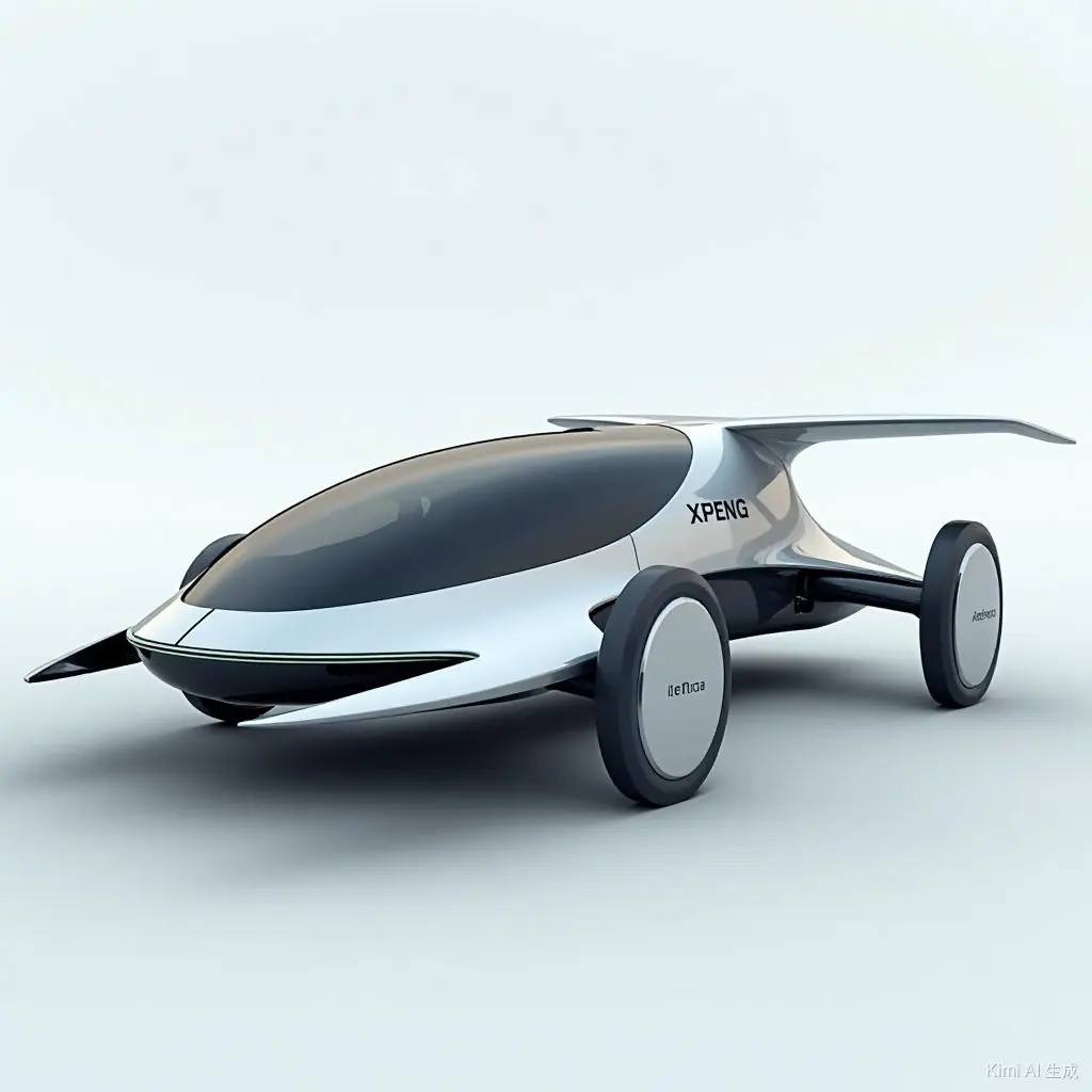 设计一个车,飞在天上,自动驾驶,配小鹏的logo,可收缩调节车子的长度和宽度,这样可以根据具体乘坐的人数,调节长度和宽度。做到灵活和实用兼备。