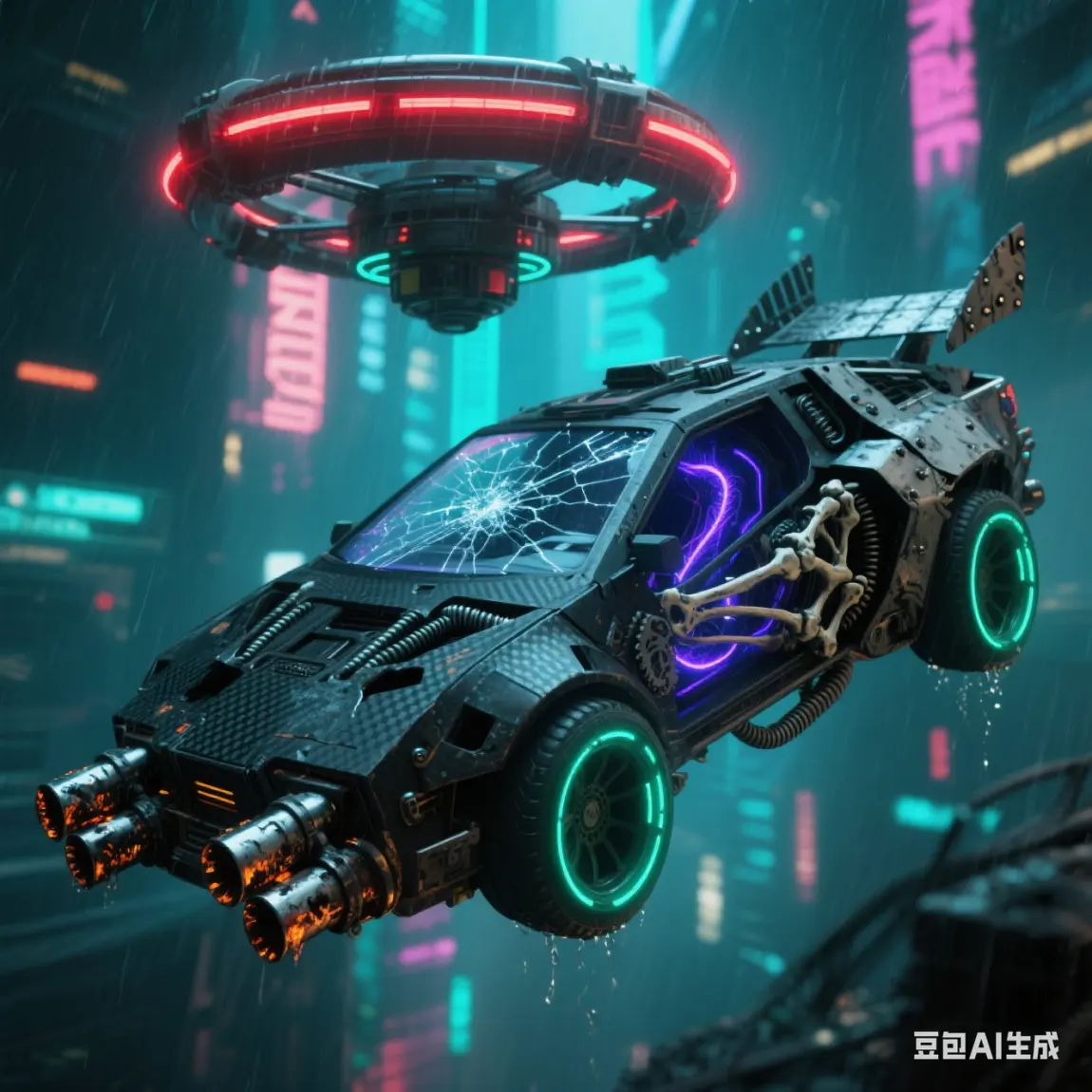 设计融合了「废墟重构」理念:车头挡风玻璃裂痕状的全息投影屏,既像故障的老电视雪花屏,又暗喻未来社会的信息碎片化;车尾尾翼被改造成废弃卫星残骸的拼接造型,铆接处渗出淡绿色冷却液,仿佛从垃圾场拾荒重组的机械生命体。当引擎启动时,车身能量导管会随脉冲频率明暗闪烁,配合悬浮时发出的电磁嗡鸣,将「高科技与低生活」的赛博朋克内核浓缩为移动的金属诗篇——它既是逃亡者的空中堡垒,也是城市废墟中流淌的机械血管。