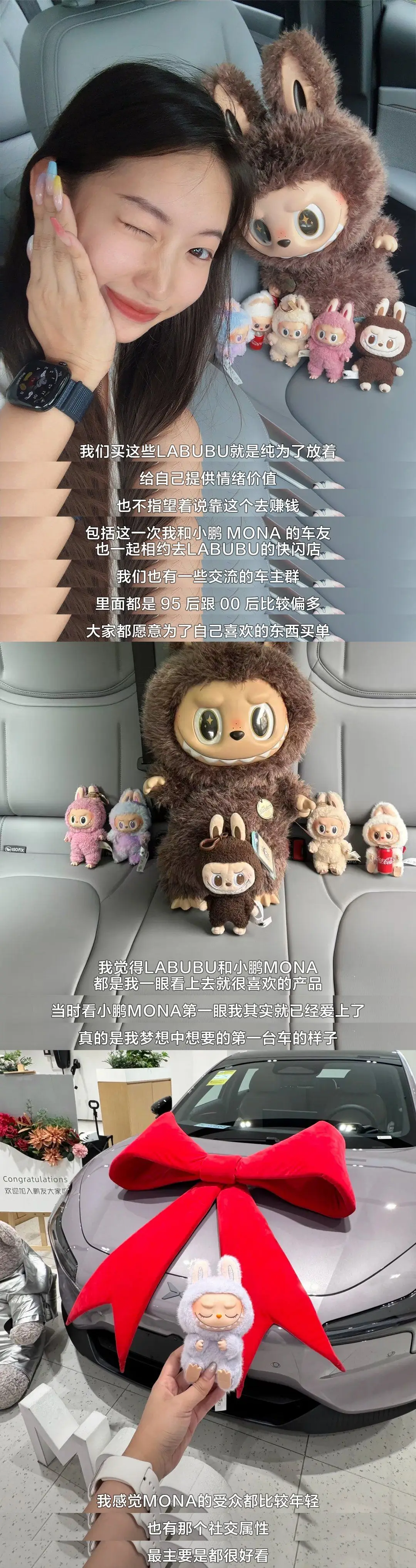 近期,社交平台上掀起了一股“MONA与LABUBU”的风潮。小鹏MONA的车主们纷纷晒出了他们与LABUBU的合影,这一独特的组合,仿佛是时尚与活力的完美邂逅。MONA的流线型车身与LABUBU的灵动形象相得益彰,展现出一种独特的潮流感。