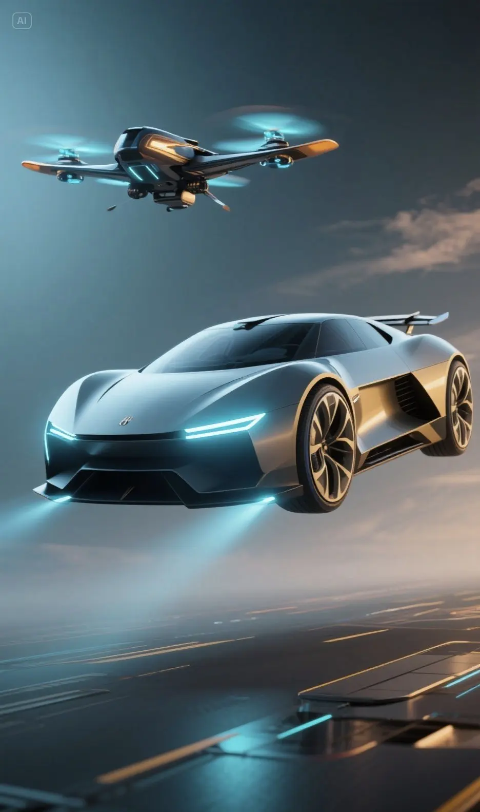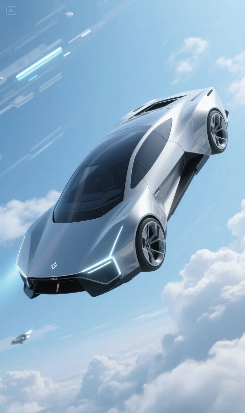通过AI软件,输入了一段指令。“做一张具有未来感,科技感的汽车”就生成以下图片,可能指令不够清楚,所以只是在空中,没有具体的飞翼。希望小鹏今后的飞天汽车能够量产,最终飞入寻常百姓家!