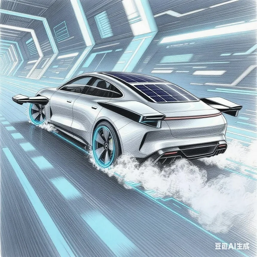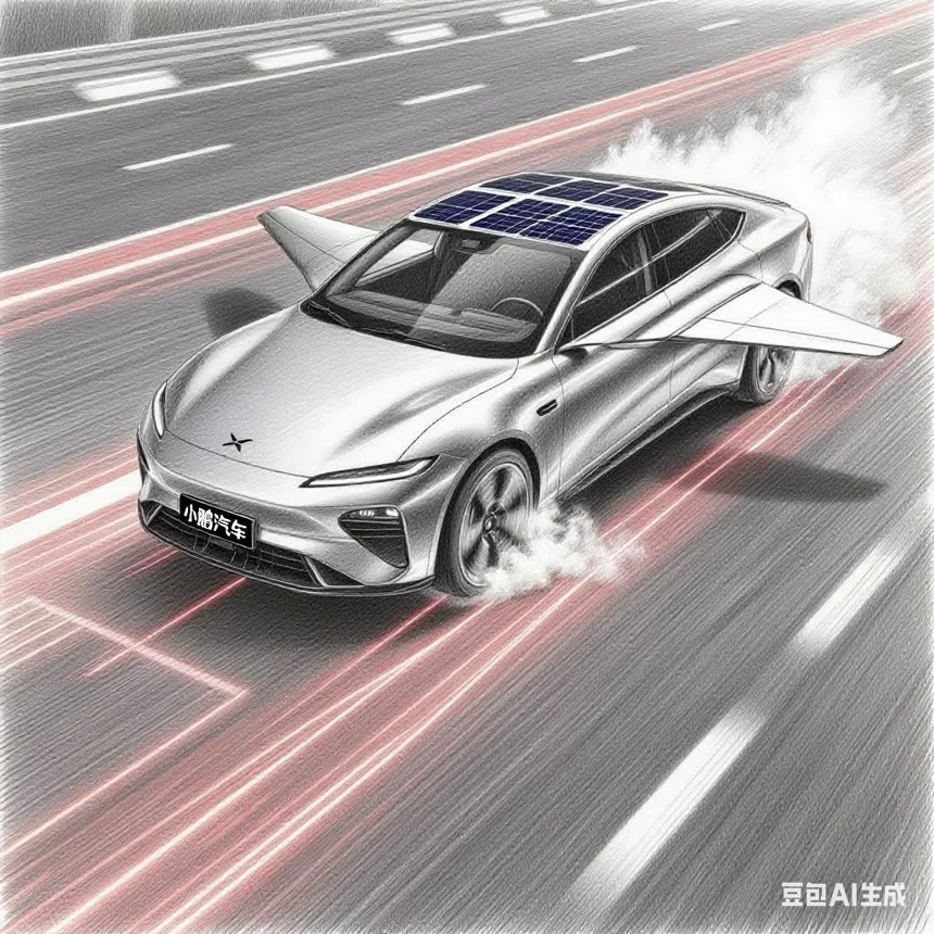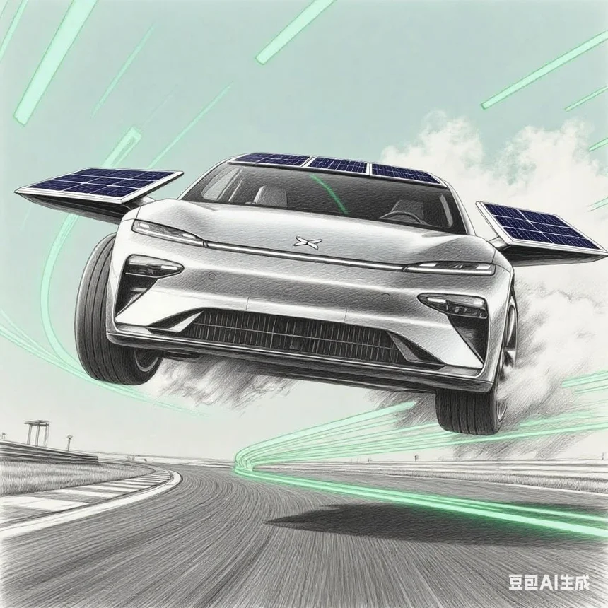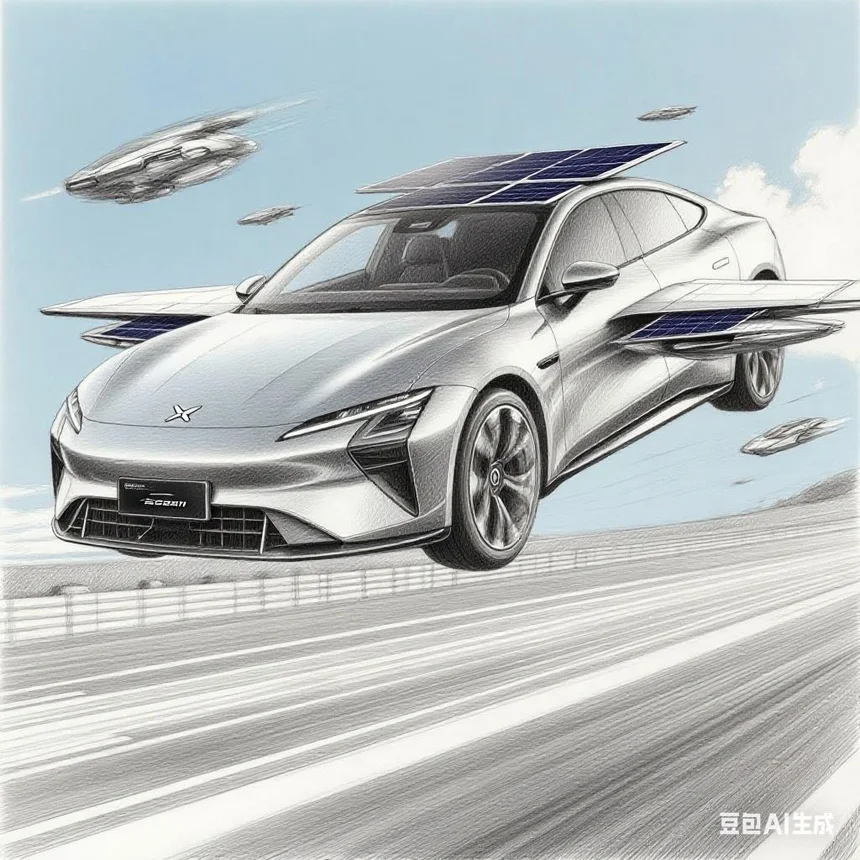 #我的科幻座驾# 以小鹏P7为原型,反光银色车漆搭配黑色车顶,极简表面勾勒未来感轮廓。车辆两侧机翼展开,如同机械大鹏展翅。车顶太阳能板微微调整角度,配合机翼的电力需求,完全展开的机翼提供强劲升力,车辆平稳翱翔于未来都市上空。太阳能板最大限度吸收光能,转化为飞行所需能源。车身整体姿态流畅优雅,银色反光车漆在高空阳光照射下熠熠生辉,黑色车顶与银色车身形成鲜明对比。