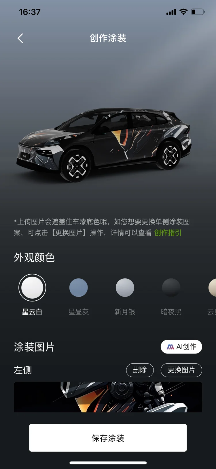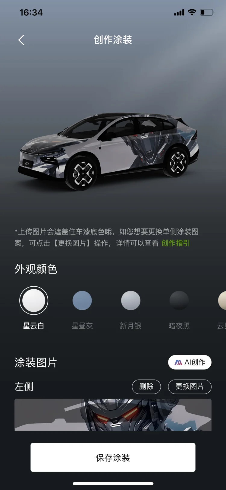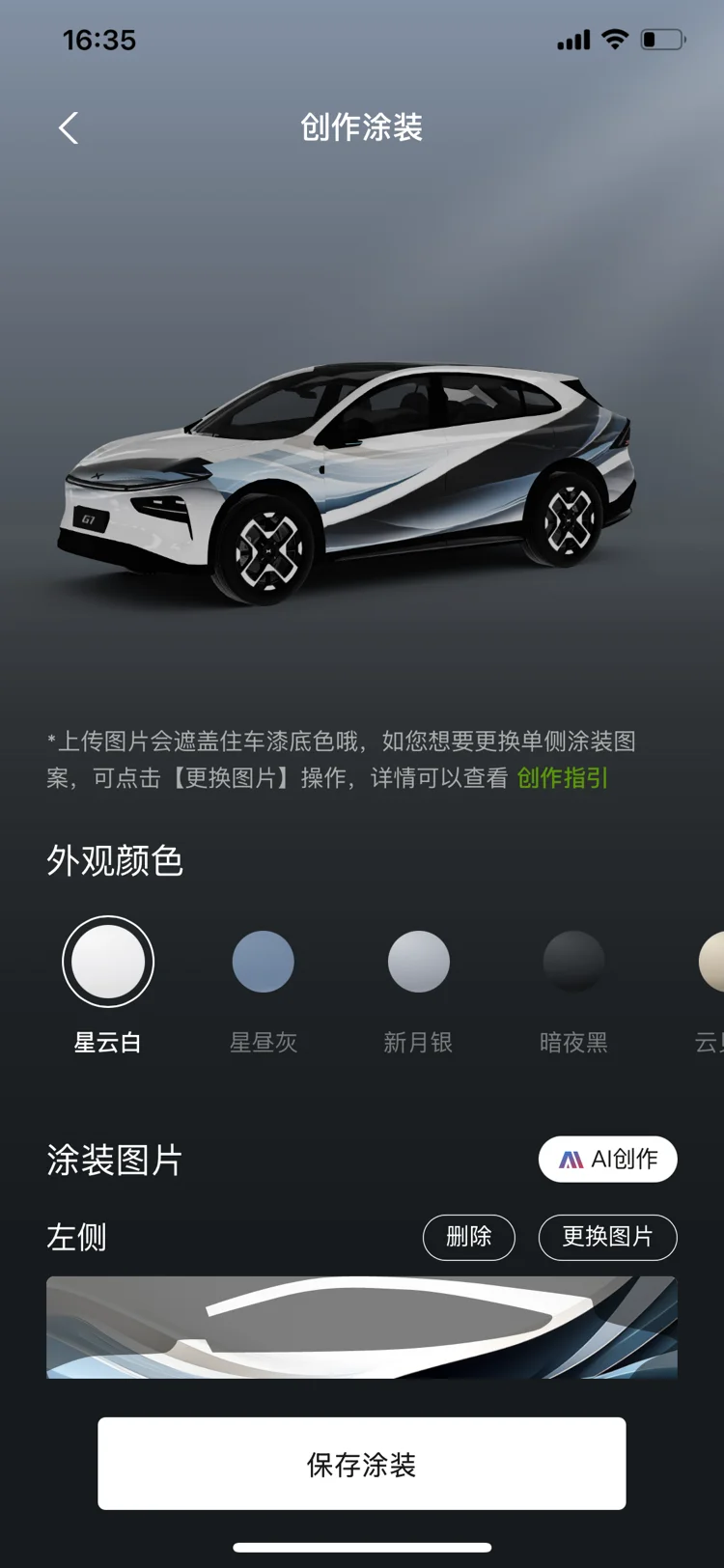 小鹏的最新款车型G7发布了,小鹏app上也即时更新了ai涂装工具,可以发挥自己的创意,大胆设计涂装,作为新势力品牌,科技感和未来感肯定是必不可少的,我首选了银色和黑色,感觉这两个底色是最适合赛博朋克风格的,当然还是选了白色做了赛道感的一个设计,设计是设计好了,但是上车的难度还是感觉蛮大的,不晓得啥时候能在路上看到一辆呢#小鹏G7涂装大师创意挑战#