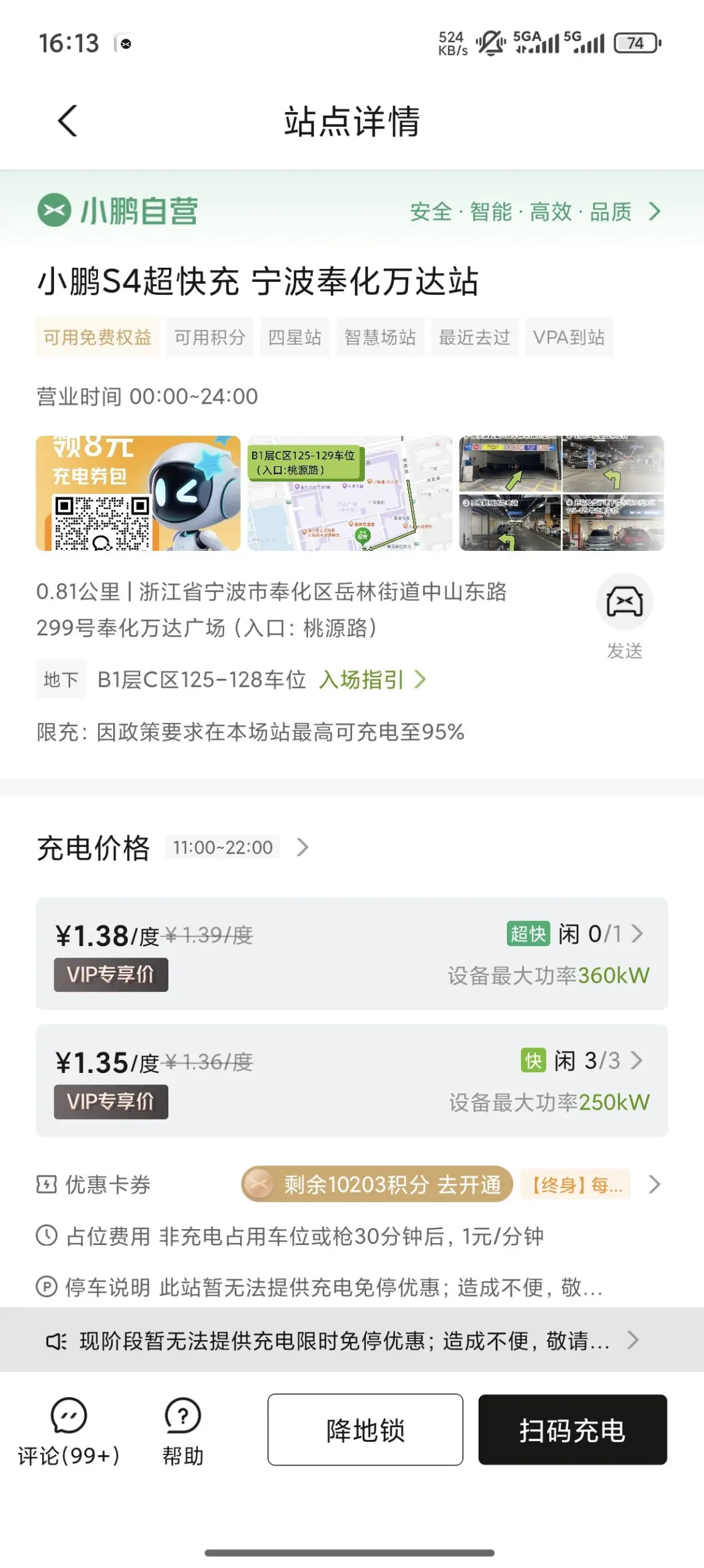 #晒出家门口小鹏会员站# 离我家最近并且最常去的小鹏会员站是奉化万达广场的小鹏自营站,这里4个180kw的超充,我的四驱版本三元电池的p7i跑到150多,这里离海边很近,可以去海边散步,希望早日升级S 4或者S 5充电桩@充电小助手