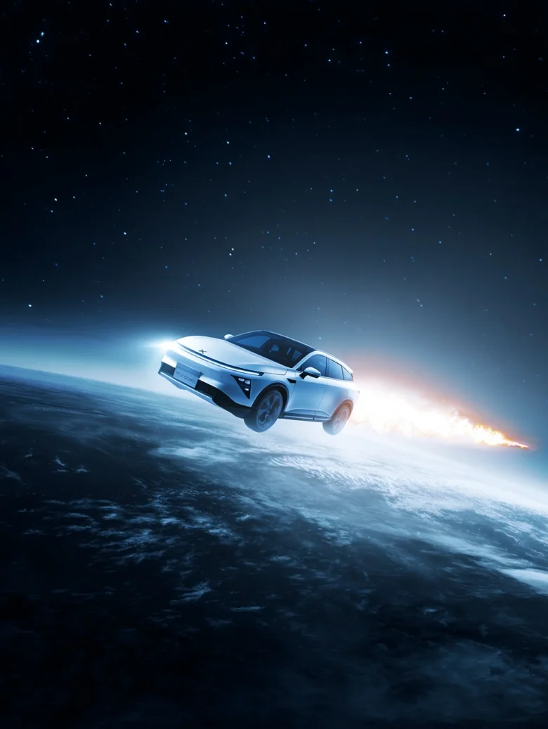 /imagine prompt: Product Photography , Commercial Photography , XPENG flying in space with Flamer , Fire-breathing flight , Earth horizon , Fast shutter , full of passion , High dimming , high angle shot , panorama , Computer white color mixing , Super Real , Super details , Super HD , --v 7 --ar 9:12 --no Ground