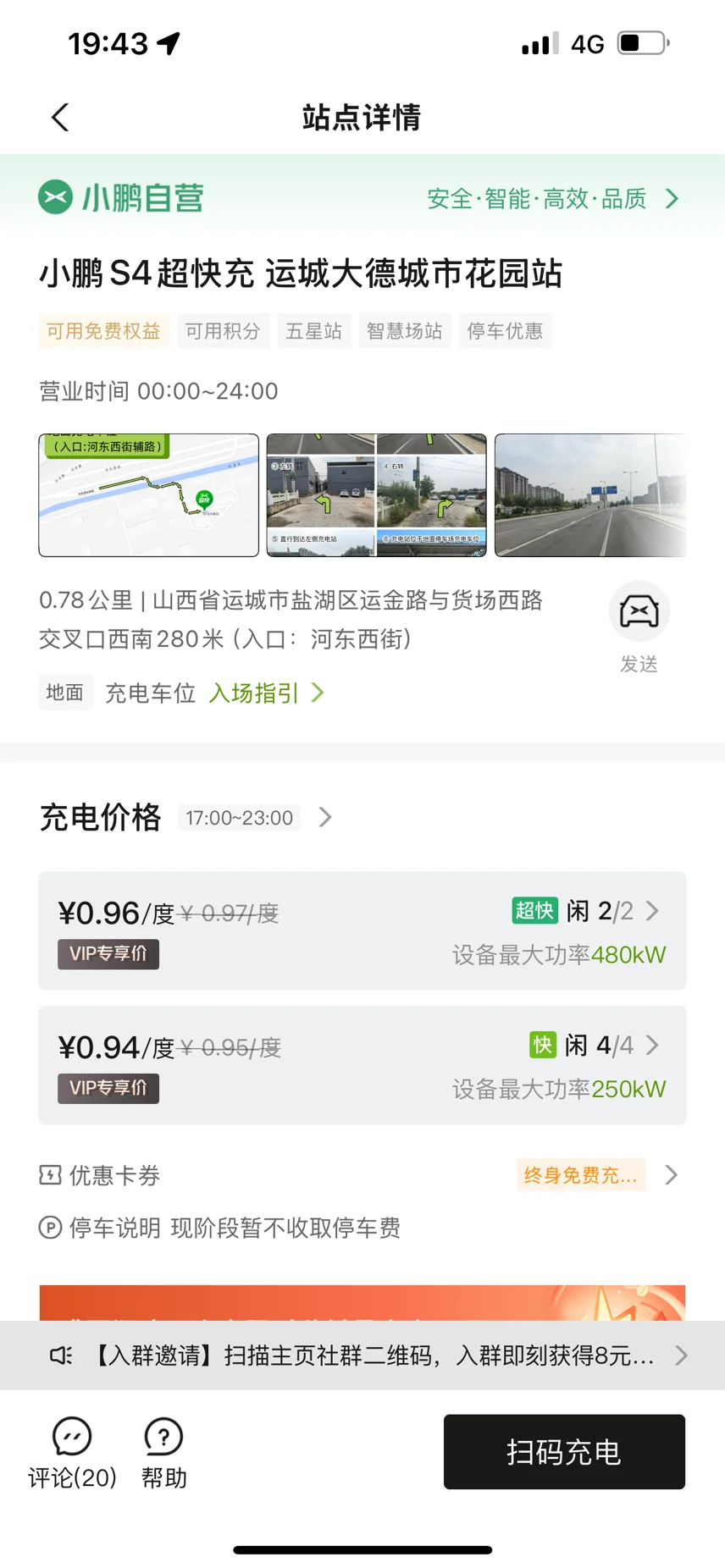 #晒出家门口小鹏会员站# 运城大德城市花园站是小鹏4s超快充站点,VIP专享价0.96元/度,非V l P 0.97元/度,满满的优越感,另外充电站还设有遮阳蓬,环境优雅、舒适,我经常去充电,欢迎鹏友们也加入VIP优惠会员充电的行列!