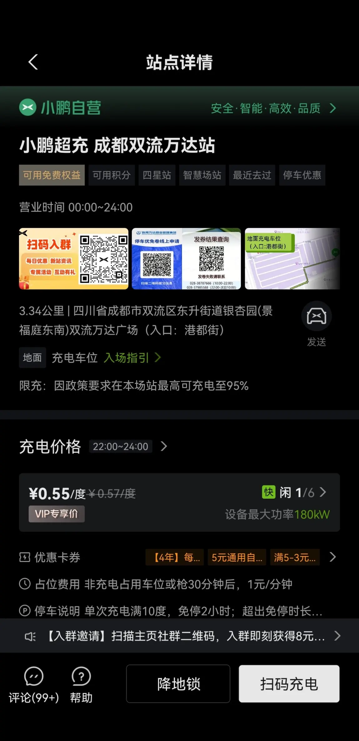 家门口的小鹏自营充电桩,真心划算,价格也实惠,功率还高,还能用积分,点卡,优惠券等,值得信赖,每晚来充电的鹏友一波接一波。