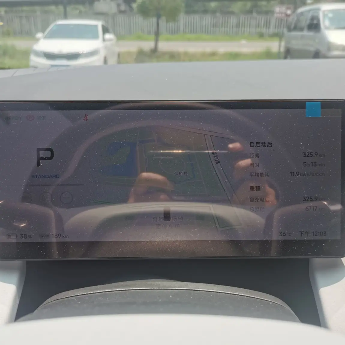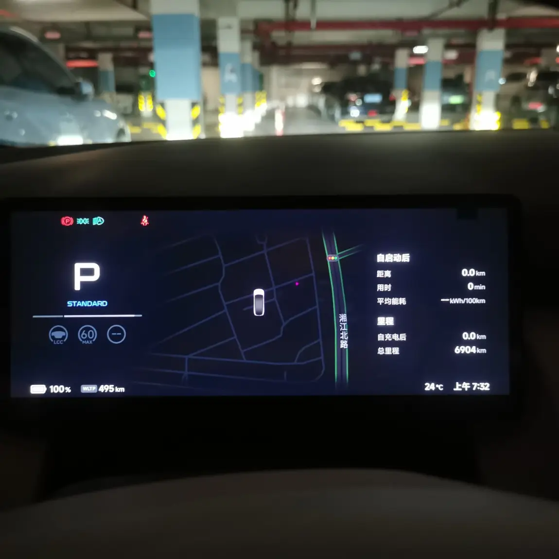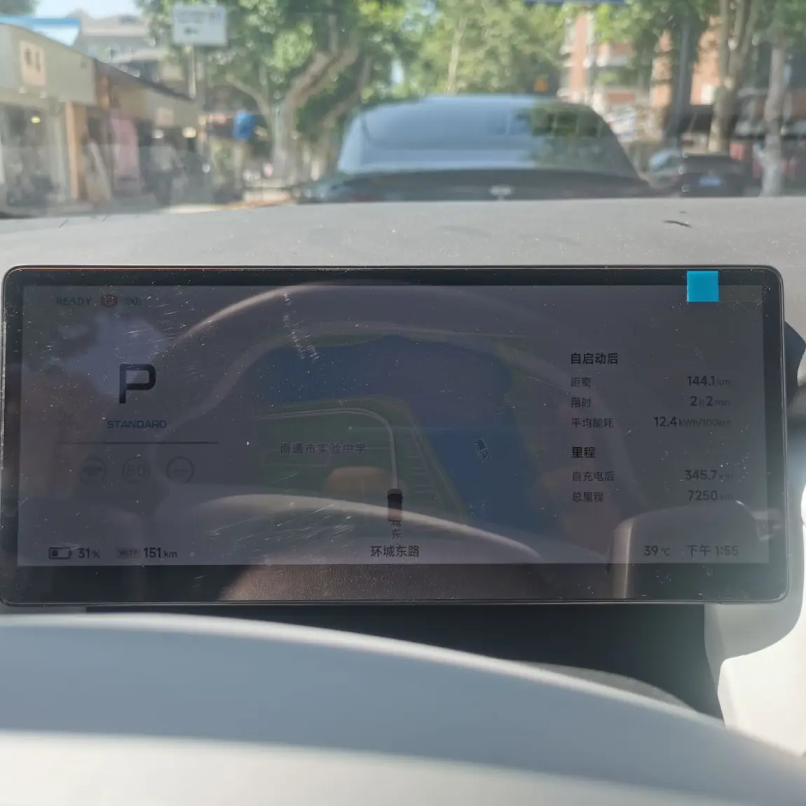 图三为后一天也是上海来回的数据,这段路程无堵车情况,高速的平均时速在110左右,车上三人,空调、座椅通风正常开启,总得能耗为12.4,按照这个显示满电可以跑490。
