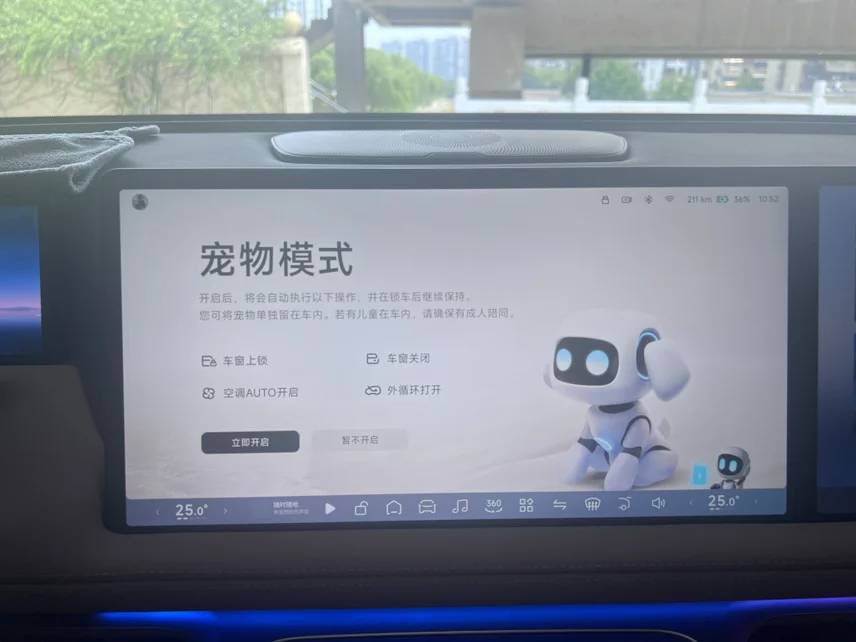 宠物模式让我带我家狗狗出门更安心。上次临时去便利店买水,就让小p打开宠物模式,设置好温度和通风后,中控屏会显示图片2上面的提示,既避免了旁人误会,又不怕小家伙闷热,细节太贴心了~
