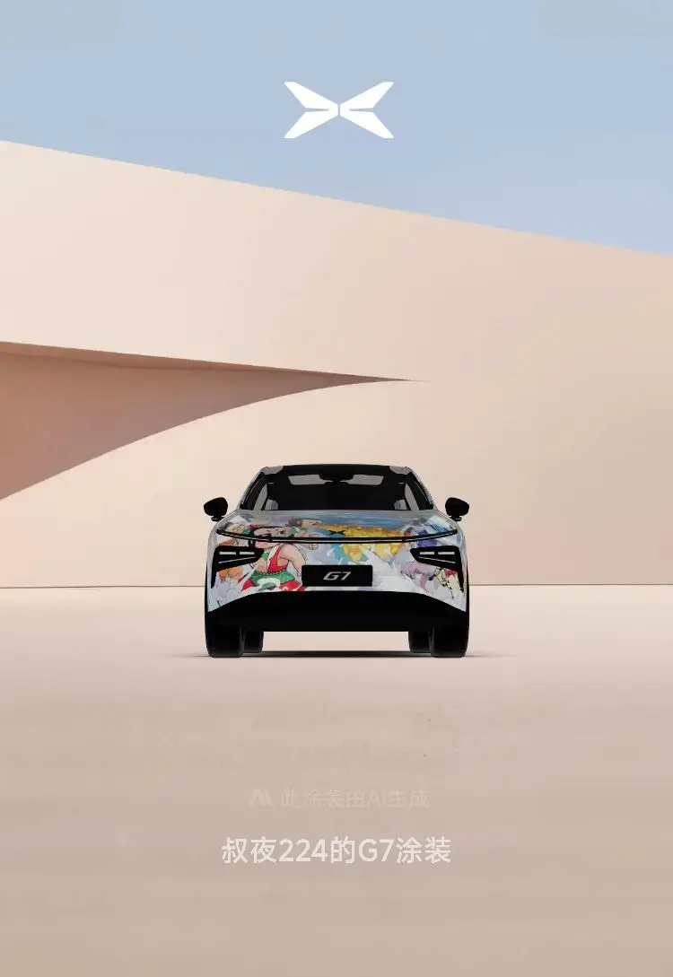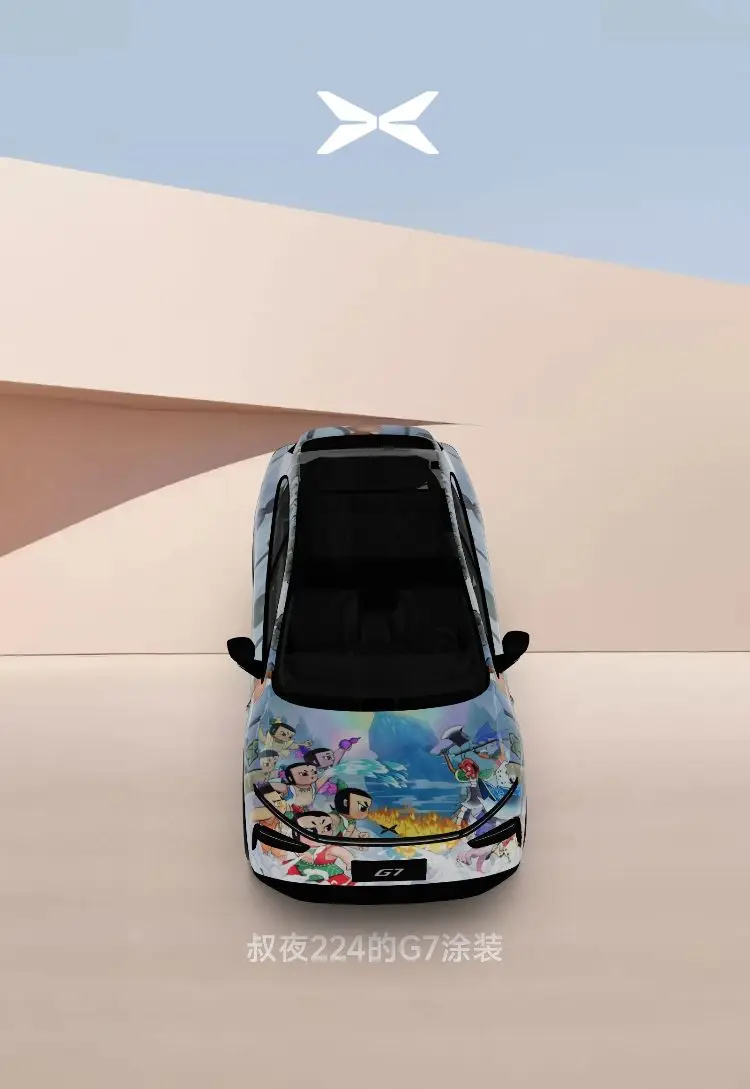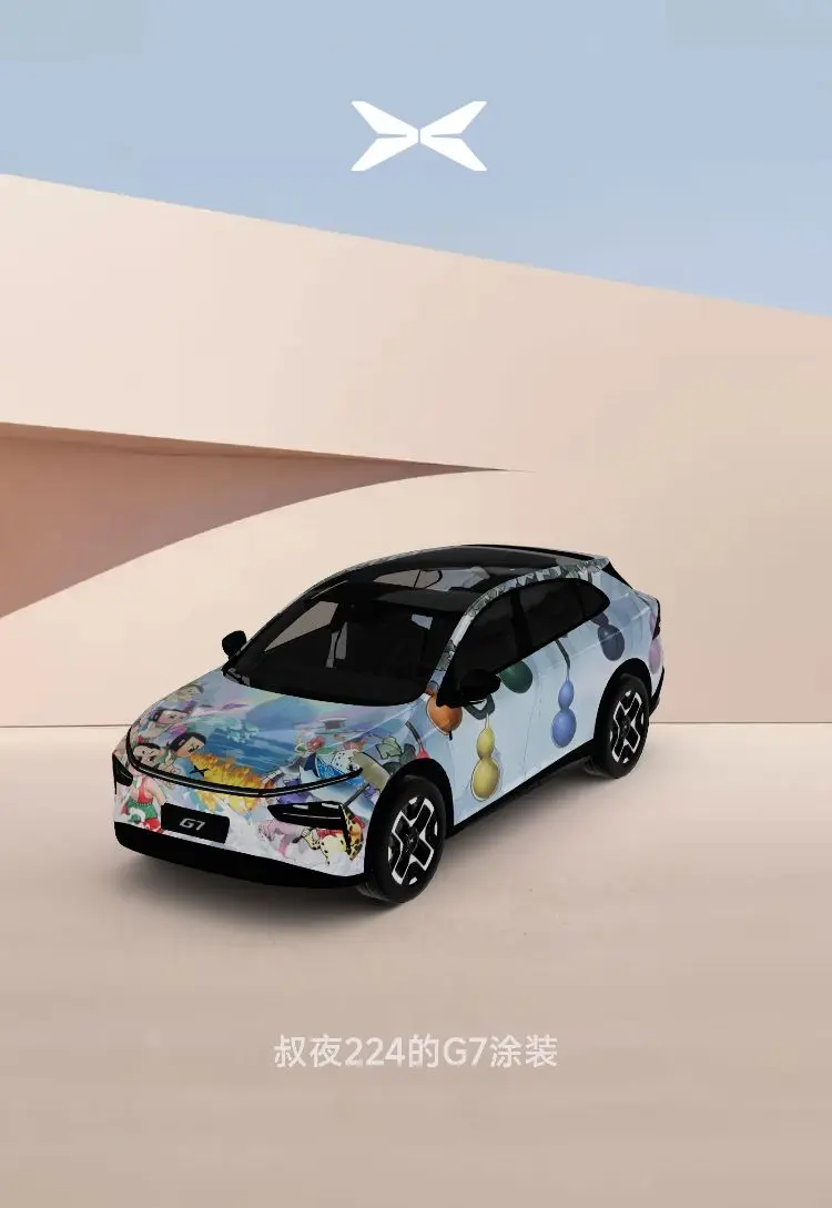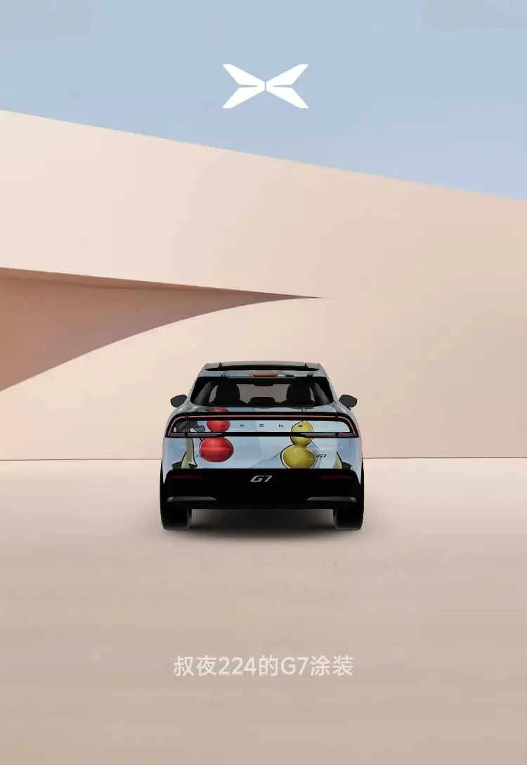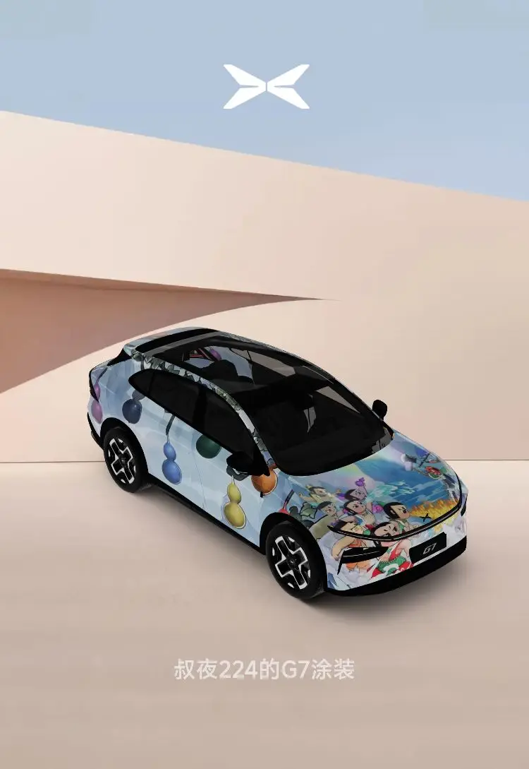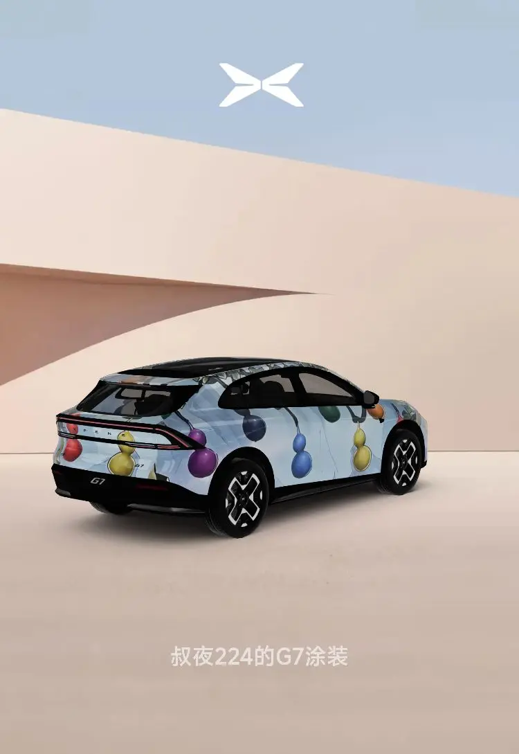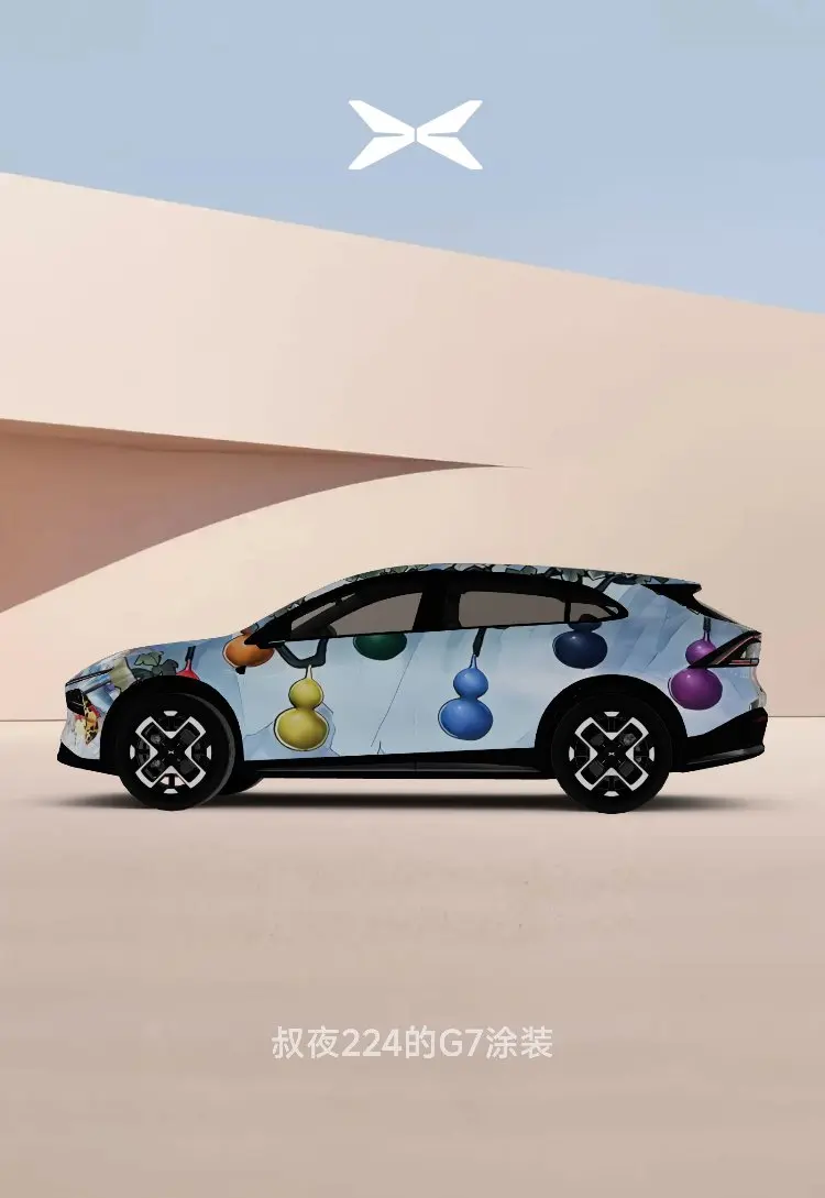 ⭐️⭐️设计理念:中国元素、人尽皆知、有趣,能反映出小鹏G7的主要特点(体现出空间属性、科技属性、情绪价值及其他有用的一些小细节),但是小鹏G7的特点太多,设计元素如果通过东拼西凑展现其不同特点,会显得车身画面比较杂乱、不好看,所以元素选取不宜过多,以保证喷绘画面的整体性、协调性。