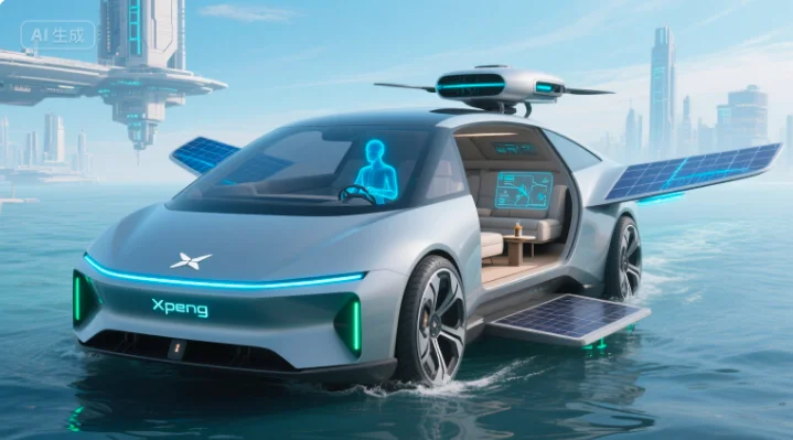 帮我生成一张图片:绘制一张来着未来的小鹏汽车,集智能伙伴、移动生活空间、绿色出行先锋等多重角色于一身,可以海陆空三栖模式一键切换