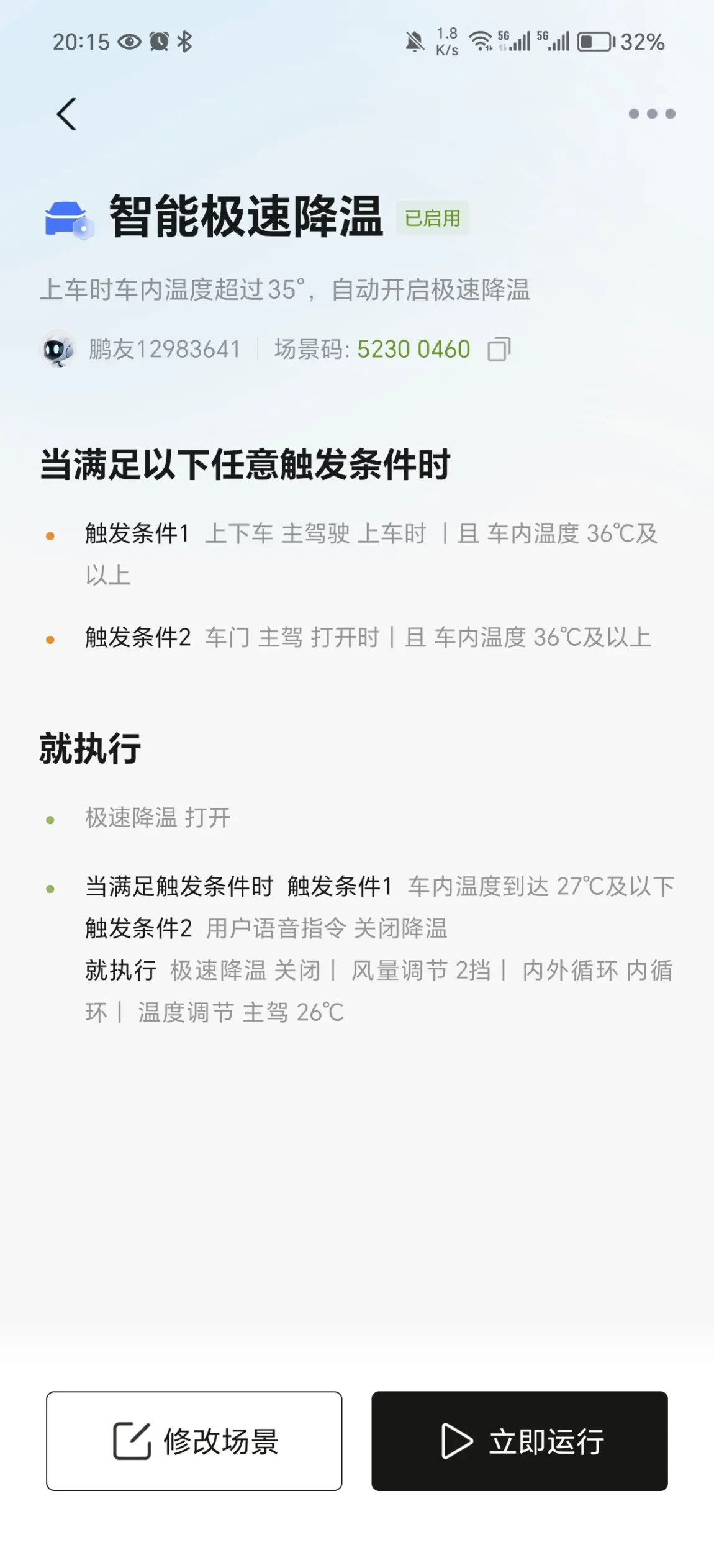 小鹏汽车的智能极速降温场景和远程开空调功能为用户带来便捷舒适的用车体验。智能极速降温场景下,用户可通过手机 APP 预约空调开启时间,如设置上班时间即将到达且车辆停放在家中时,车内空调自动开启极速降温,到达预设温度时再调节风速风量保持舒适状态,上车即享清凉。另外,还可设置当车内温度高于 30℃或 35℃时自动开启极速降温,直至车内温度低于设定温度或用户语音指令关闭,极速降温时温度和风力会自动设置为最低和最大。