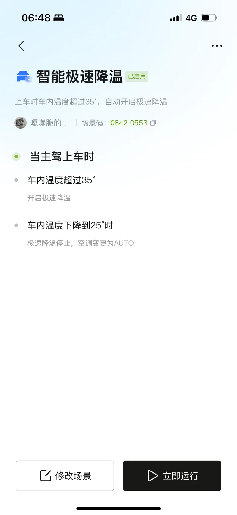 • 极速降温:创建智慧场景「智能极速降温」,触发条件为「上车时车辆温度>35℃」,执行动作开启极速极速降温。