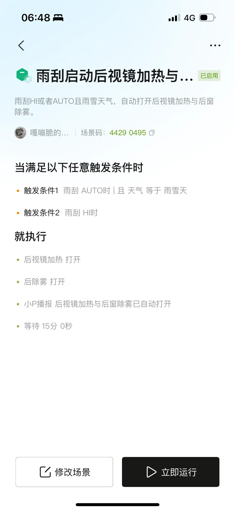 • 雨刮后视镜加热联动开启:创建智慧场景「雨刮启动后视镜加热与后窗除雾」,触发条件为「雨天雨刮开启时」,执行动作开启后视镜加热与后窗除雾。