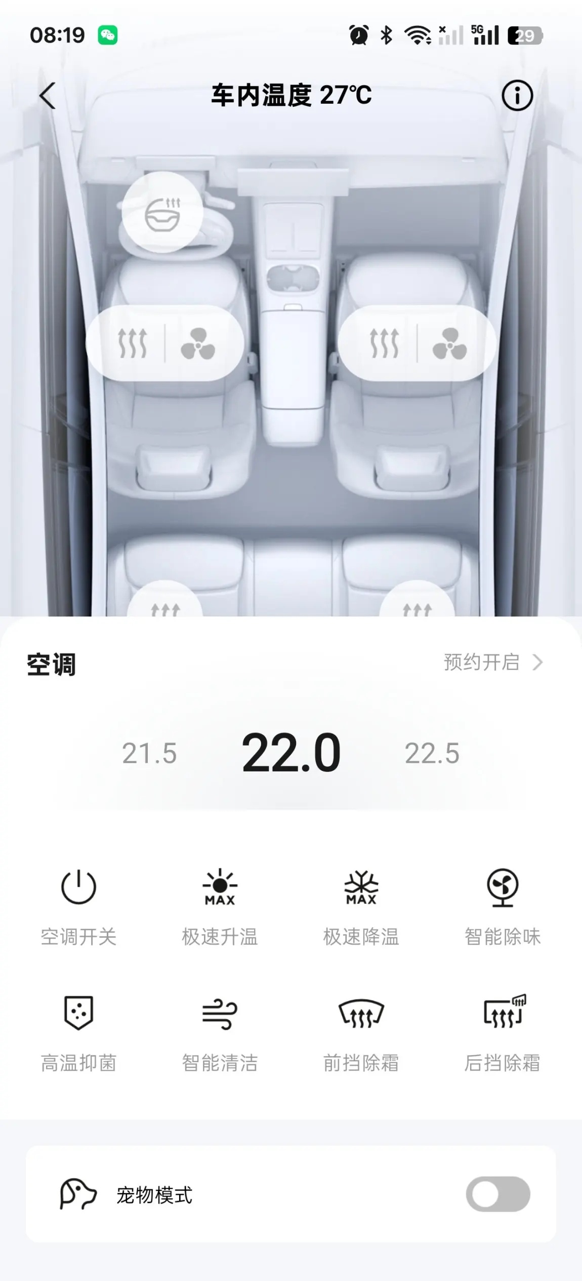 上车前 3 分钟用 APP 远程启动空调,直接拉到最低温 + 最大风量,同时打开座椅通风(三档可调真的爽),体感瞬间从 “桑拿房” 切换到 “空调房”。